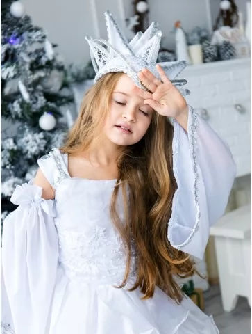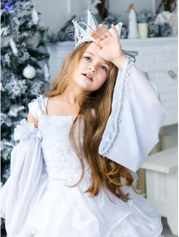 Легкий, повітряний та неймовірно ніжний образ створює відчуття справжньої зимової магії. Багатошарова білосніжна сукня з хвилястими оборками та широкими рукавами красиво рухається під час кожного кроку, а срібляста корона додає королівської величі. Такий варіант ідеально підходить для оренди карнавальних костюмів на новорічні виступи, фотосесії та святкові заходи. Пишна каскадна спідниця виглядає особливо ефектно на сцені та в кадрі, створюючи об’єм і легкість. Напівпрозорі рукави з делікатним оздобленням додають образу витонченості, а корона підкреслює казковий характер героїні.
