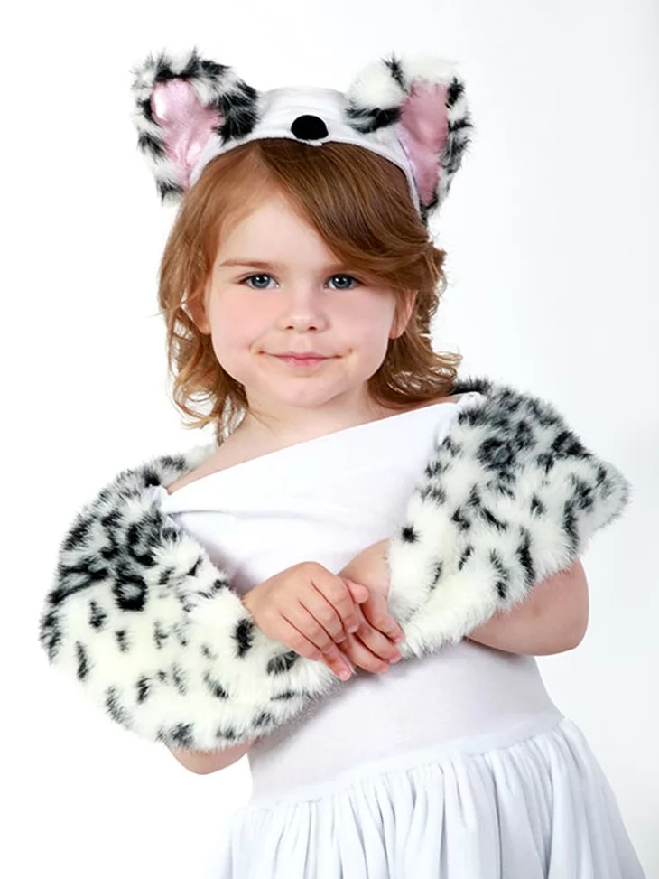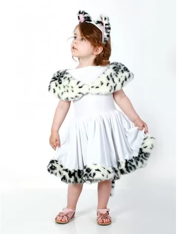 Милий, ніжний і по-дитячому чарівний образ маленької пухнастої красуні. Біла сукня виглядає легко та святково, а м’яке оздоблення з плямистим хутряним ефектом додає образу грайливості. Обруч із вушками та маленький хвостик створюють повноцінне перевтілення у кумедну кицю. Костюм виглядає дуже акуратно та зручно підходить для найменших модниць. Чудовий вибір для оренди карнавальних костюмів на дитячі ранки, фотосесії та тематичні свята.
