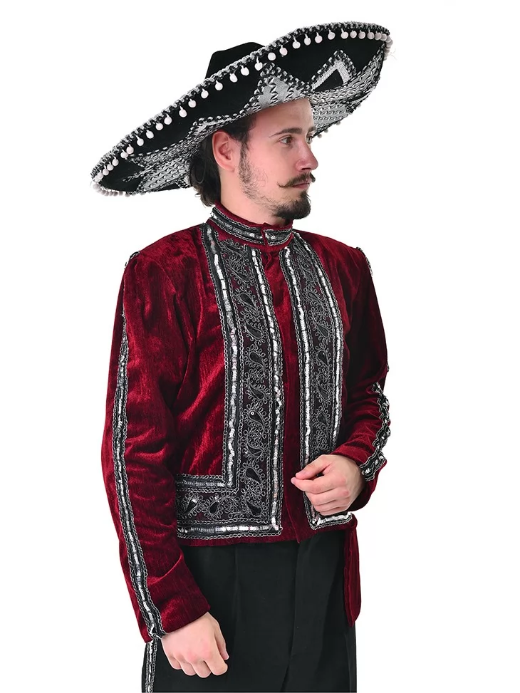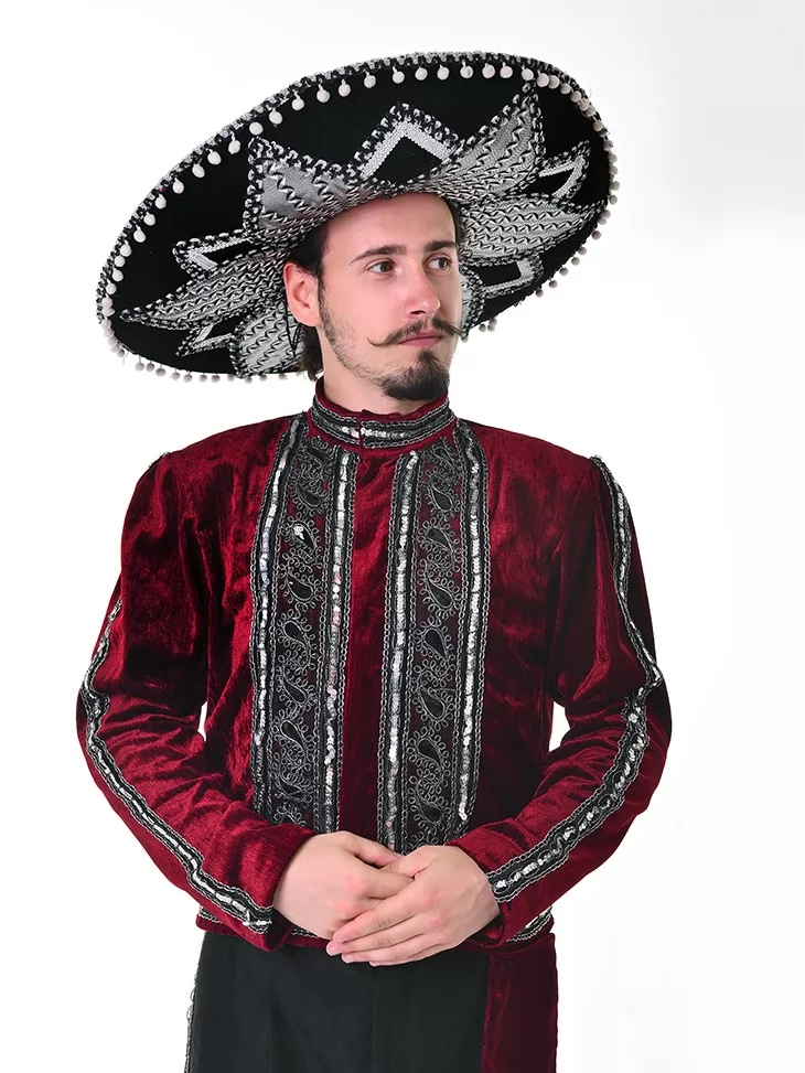 Костюм Червоного Мексиканця — це втілення колориту Мексики та святкового настрою. Бархатисте полотно насиченого винного кольору поєднується з розкішним срібним декором, створюючи яскравий та незабутній образ. Такий варіант чудово підходить для виступів, карнавалів, фотосесій або вечірок. Прокат карнавальних костюмів відкриває можливість побути зіркою свята.
