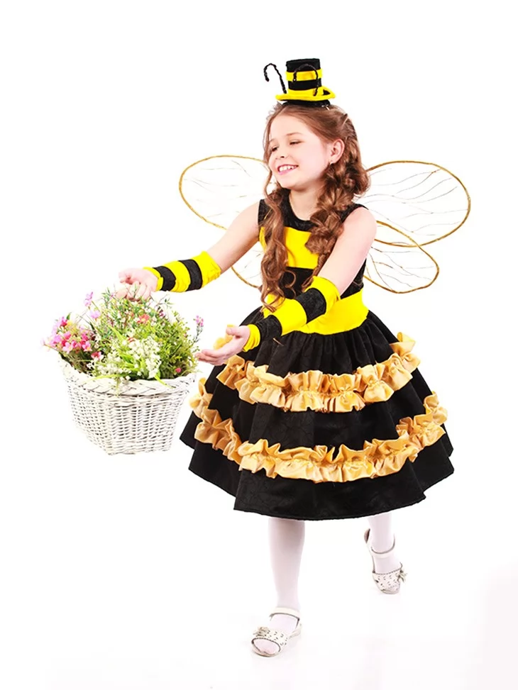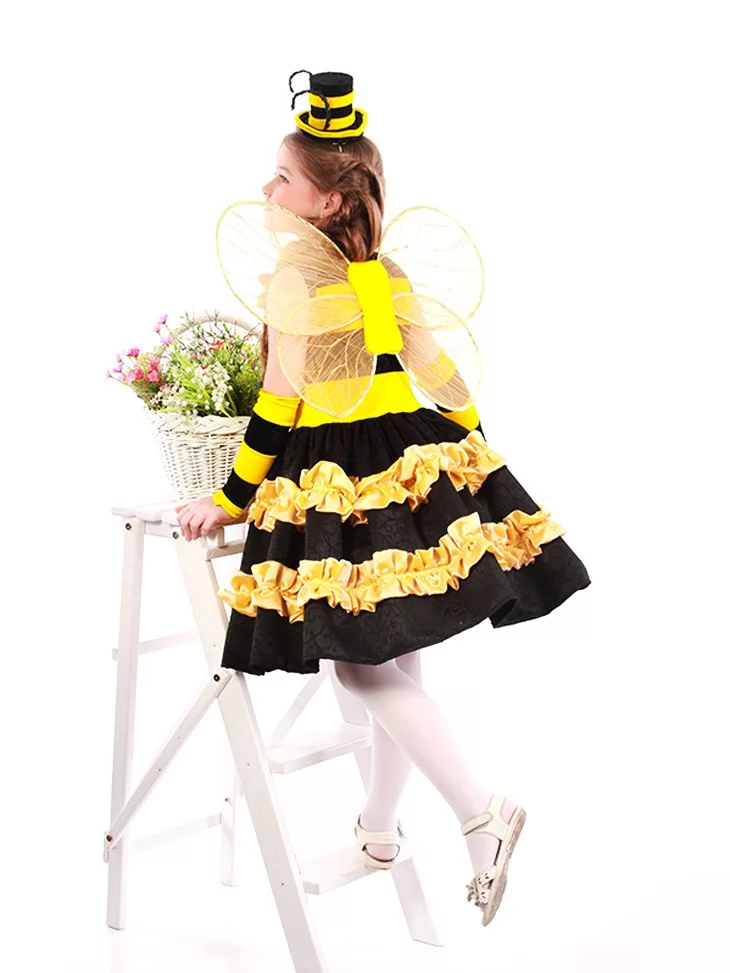 Теплий, яскравий і по-справжньому казковий образ маленької трудівниці наповнює свято радістю літа та ароматом квітів. Контрастна жовто-чорна сукня з пишною багатоярусною спідницею виглядає святково й дуже сценічно, а декоративні рюші створюють об’ємний силует, що красиво рухається під час танцю. Прозорі крильця додають легкості, а міні-капелюшок з вусиками робить образ завершеним і надзвичайно милим. Цей костюм чудово підходить для оренди карнавальних костюмів на дитячі ранки, вистави та тематичні свята природи.