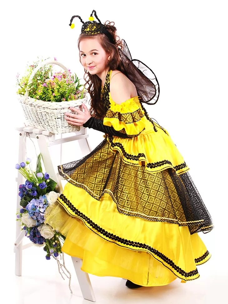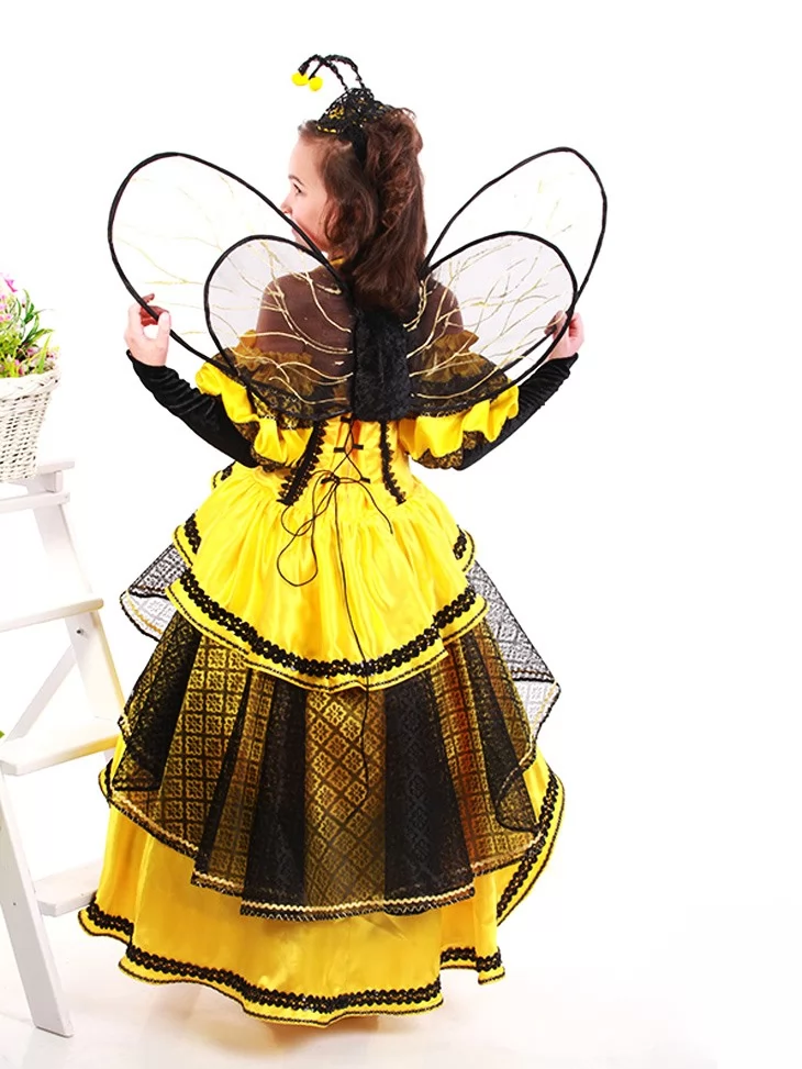 Розкішний, яскравий та по-справжньому казковий образ перетворює маленьку принцесу на чарівну бджілку з медового королівства. Насичена жовта сукня з багатошаровою спідницею, чорним мереживним декором і витонченими акцентами виглядає святково та сценічно, створюючи ефект справжнього карнавального дива. Великі прозорі крильця додають легкості, а корона з вусиками підкреслює королівський характер образу. Це чудовий вибір для оренди карнавальних костюмів на виступи, свята та яскраві фотосесії.