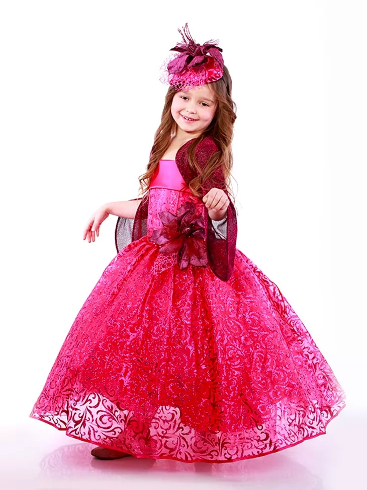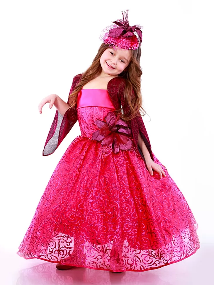 Вишуканий квітковий образ із нотками королівської розкоші, глибокого кольору та витонченої сценічної елегантності. Пишна сукня насиченого малиново-рожевого відтінку з декоративним візерунком створює ефект розквітлої орхідеї у вечірньому сяйві. Об’ємна квітка на талії підкреслює квіткову тематику, а прозорі рукави-накидка додають образу легкості та грації. Елегантний головний убір із декоративною квіткою завершує композицію та надає силуету справжньої святкової величі. Цей образ стане бездоганним вибором для оренди карнавальних костюмів на урочисті події, виступи та фотосесії.