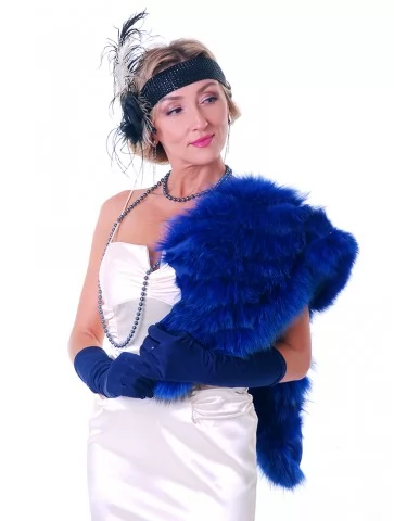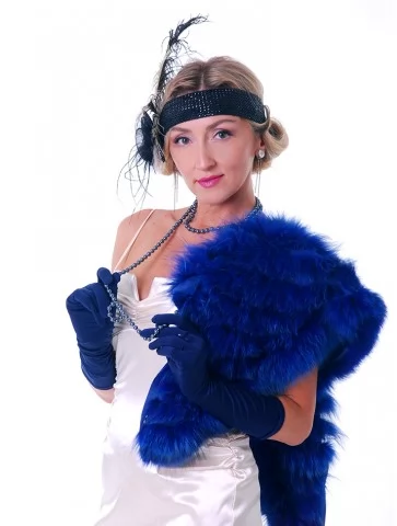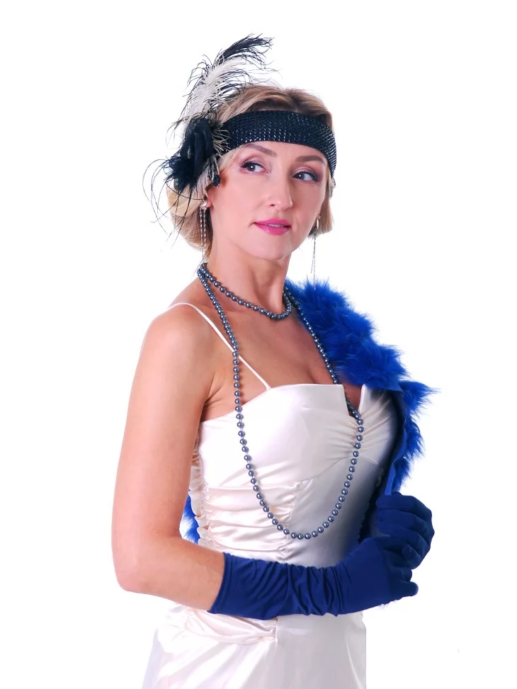 Елегантний та вишуканий образ у стилі ретро 1920-х років, що передає атмосферу джазових вечорів, шампанського та світського блиску. Біла атласна сукня з лаконічним силуетом поєднується з глибокими синіми акцентами, створюючи контрастний, аристократичний та дуже фотогенічний образ. Це ідеальний варіант для оренди карнавальних костюмів у стилі епохи Gatsby.