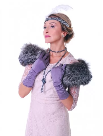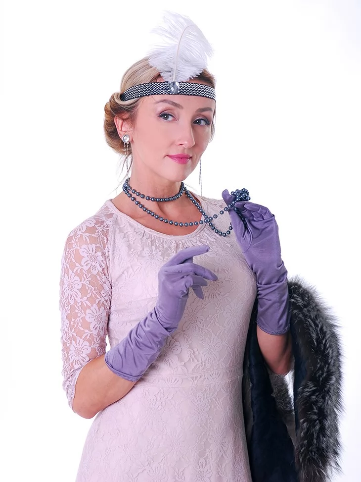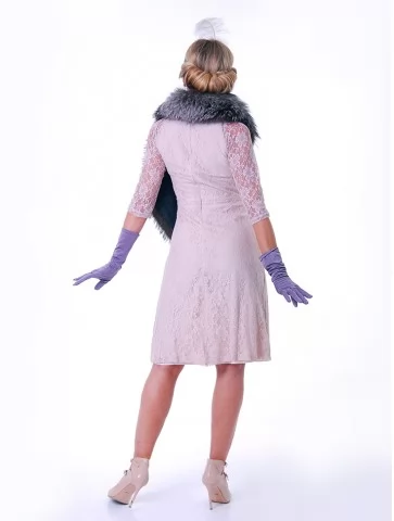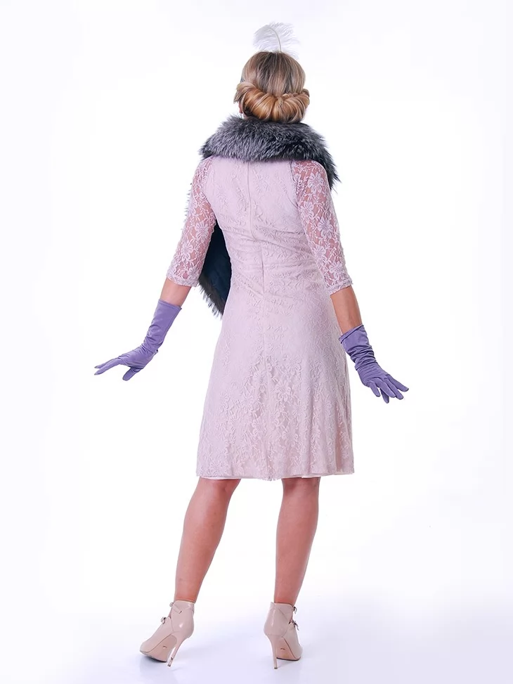 Витончений і шляхетний образ, що переносить у світ джазових салонів, шампанського та тихої розкоші епохи 1920-х. Ажурна сукня ніжного відтінку створює легкий, аристократичний силует, а хутряний акцент додає статусності й сценічного шарму. Перлинне намисто, пов’язка з пером і довгі рукавички формують впізнаваний образ світської дами, який чудово підходить для оренда карнавальних костюмів у стилі ретро.