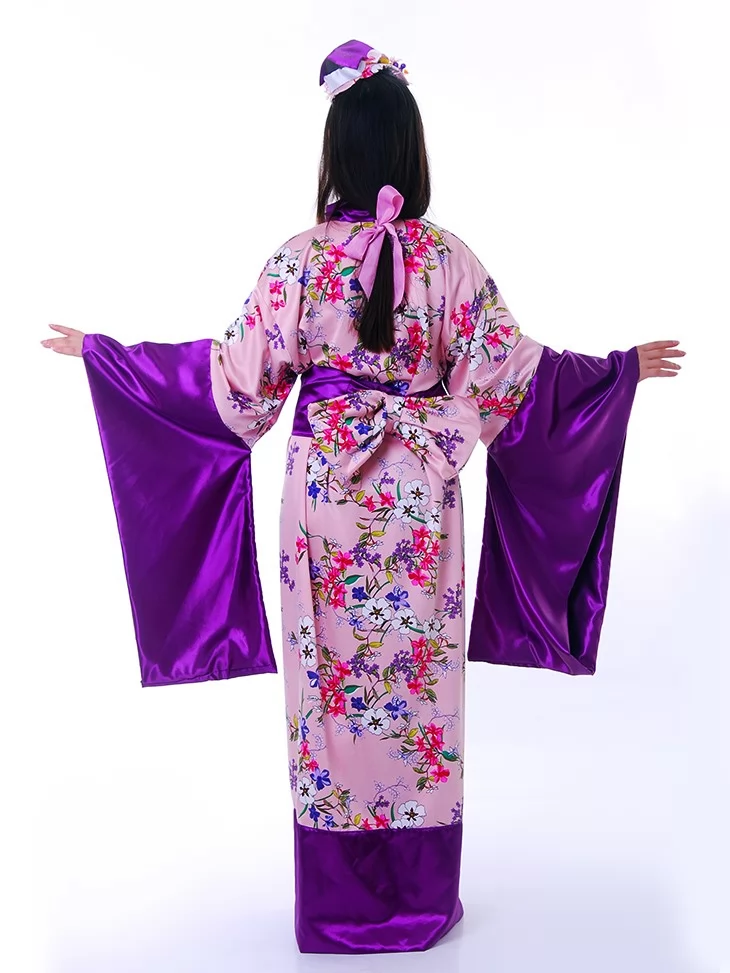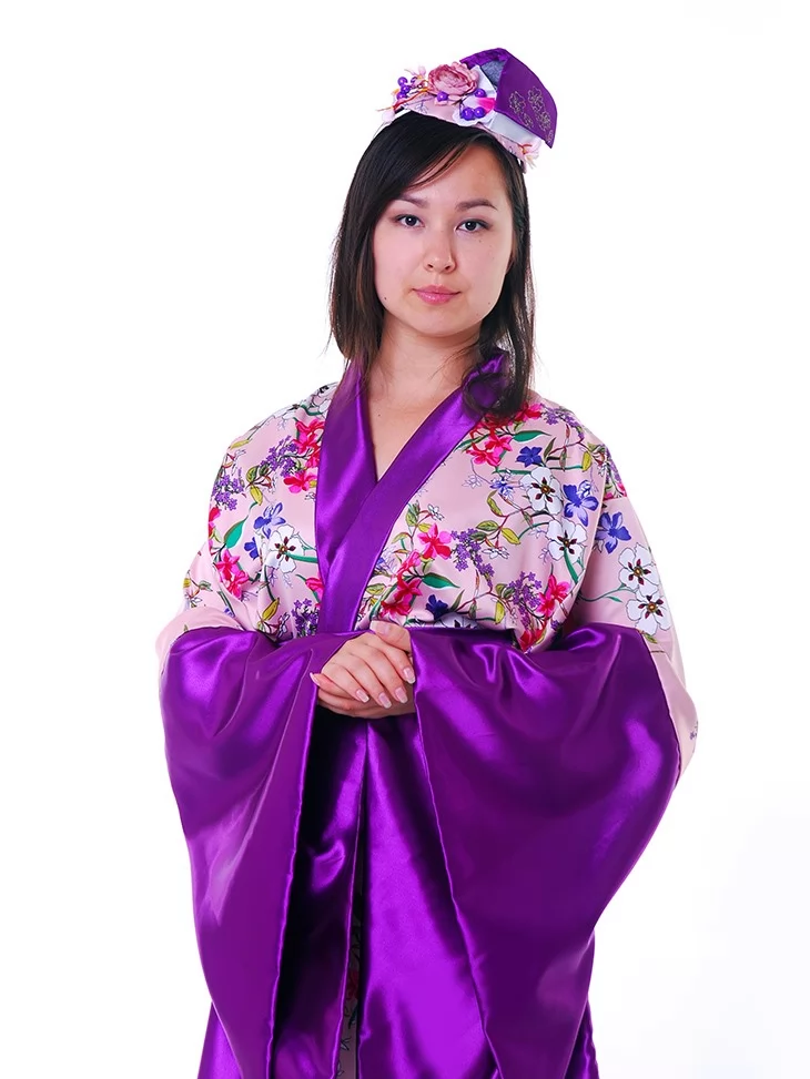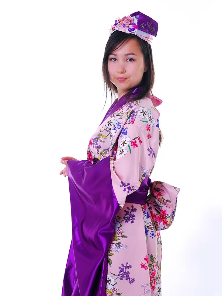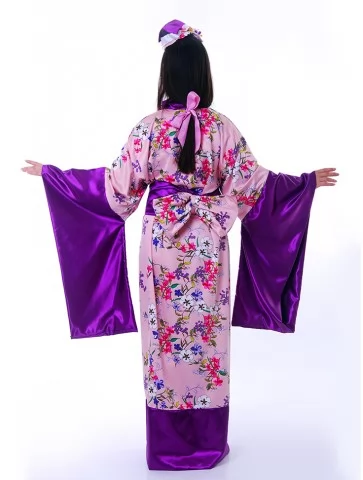 Костюм «Геїші» вражає поєднанням ніжно-рожевого фону з розкішним фіолетовим оздобленням. Квітковий принт додає образу витонченості, а глибокий колір шовковистого паска створює враження благородної гармонії. Головний убір з квітами завершує цей елегантний образ, ідеально пасуючи до тематичних подій. Оренда карнавальних костюмів — це можливість втілити мрію про східну красу без купівлі.