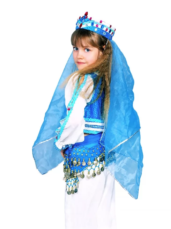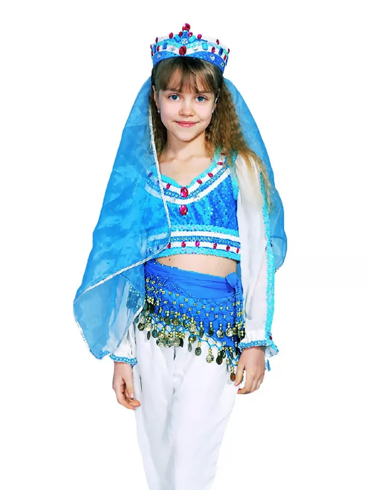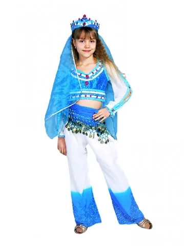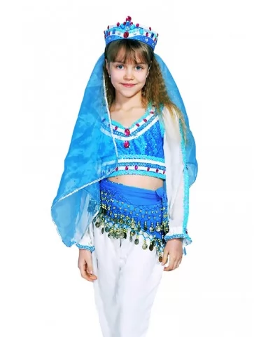 Яскравий сценічний образ, сповнений легкості, руху та східної казки. Поєднання насиченого блакитного кольору з білими елементами створює відчуття прохолоди, води й танцювального ритму. Костюм виглядає дуже ефектно на сцені, красиво підкреслює рухи рук і корпусу, тому чудово підходить для оренда карнавальних костюмів на концерти, свята та виступи.