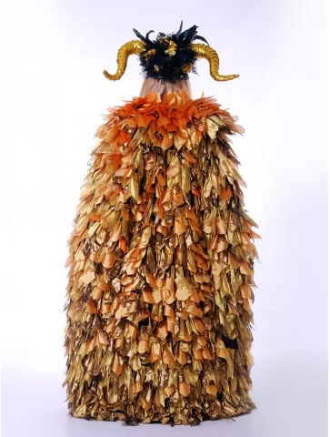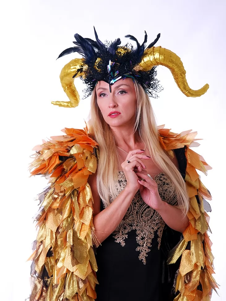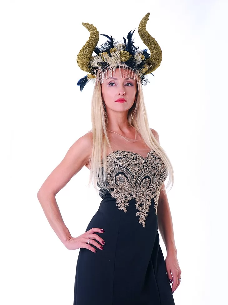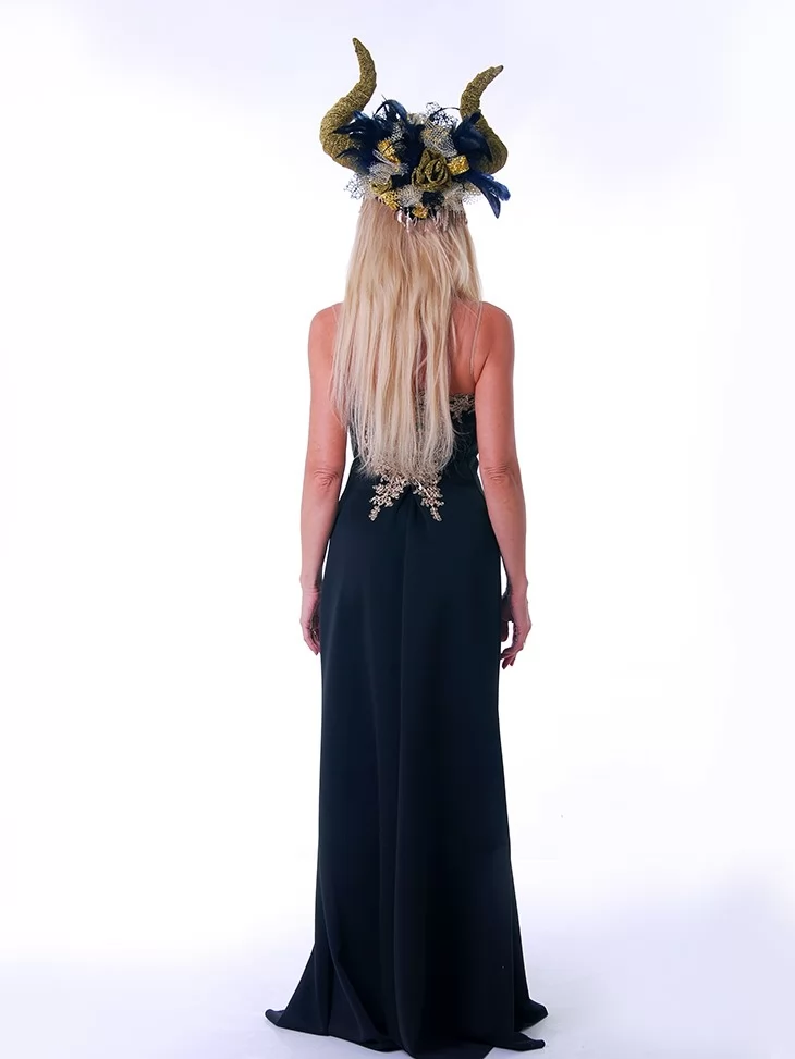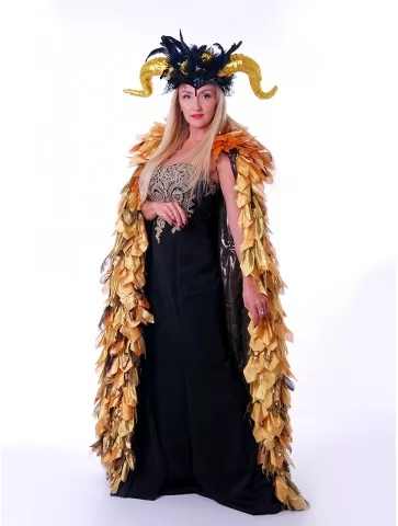 Містичний та спокусливо елегантний образ лісової володарки, що поєднує темну магію природи з розкішною жіночністю. Глибокий чорний колір сукні у поєднанні з вишуканою вишивкою та рогатим головним убором створює сильний, загадковий силует. Стрункий крій підкреслює фігуру, а декоративний ліф додає образу казкової величності. Це ідеальний варіант для оренди карнавальних костюмів на тематичні вечірки, шоу-програми, фотосесії та фентезі-заходи, де хочеться виглядати ефектно й незабутньо.