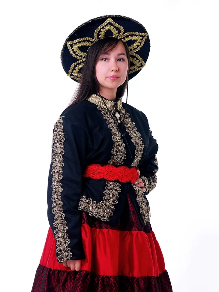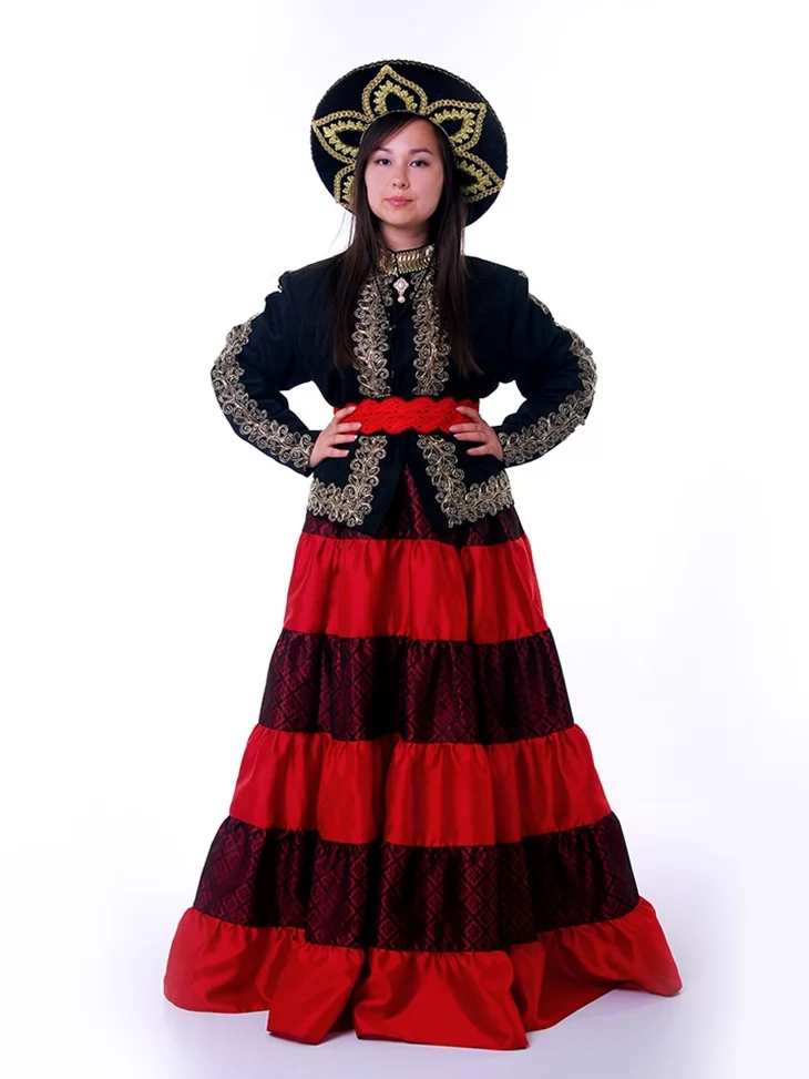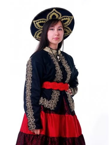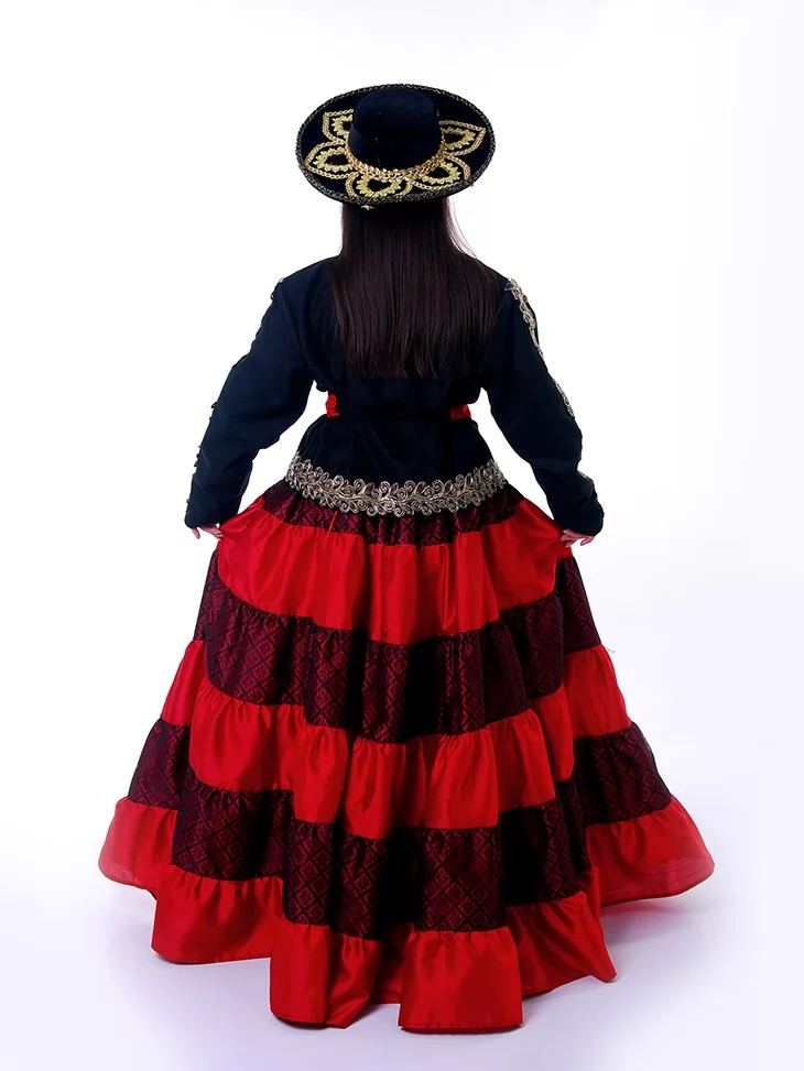 Цей образ уособлює глибоку повагу до мексиканських традицій, жіночу гідність і святкову урочистість. Поєднання насиченого чорного верху з багатою золотою вишивкою та яскравої червоної багатоярусної спідниці створює сильний, впізнаваний силует. Широкий капелюх із декоративним орнаментом додає образу національного характеру й завершеності. Це виразний варіант для оренди карнавальних костюмів, коли важливо передати культуру, стиль і настрій Мексики.