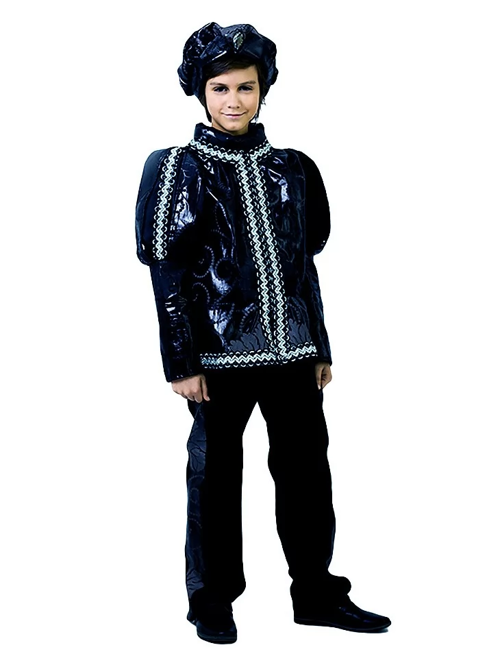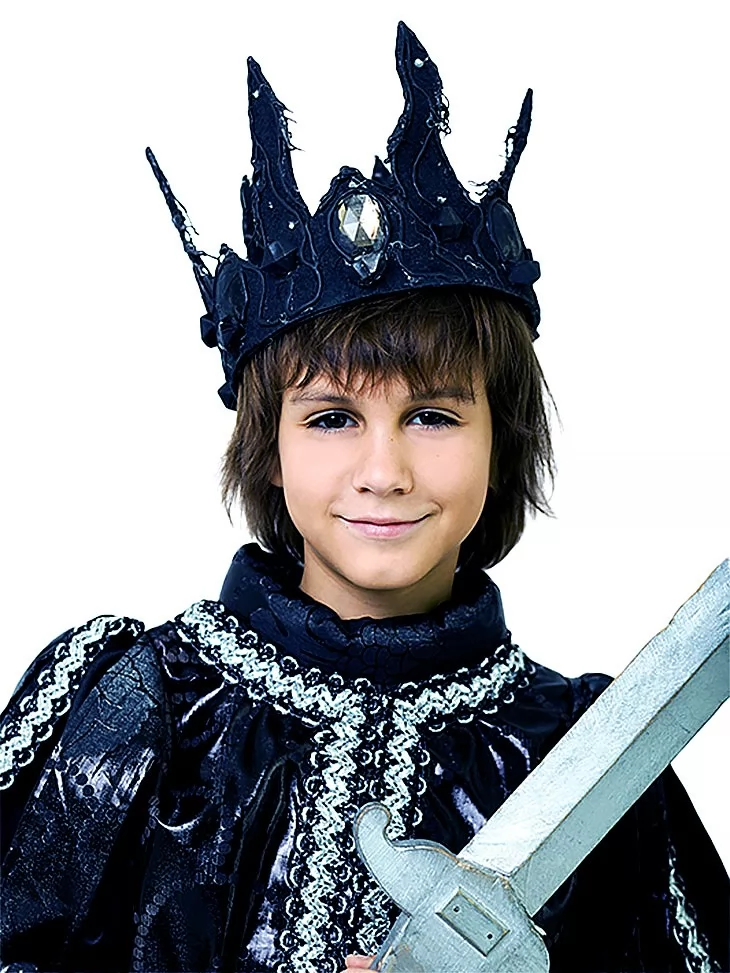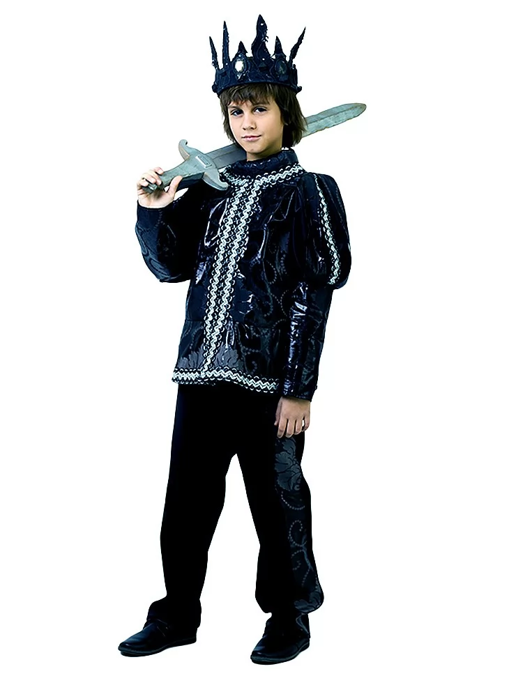 Цей ефектний образ створений для героя, який править не лише королівством, а й ніччю. Темний костюм із благородним блиском тканини та короною виглядає загадково. Ідеальний варіант для оренди карнавальних костюмів на Хелловін, тематичні вечірки, виступи, фотосесії та казкові постановки.