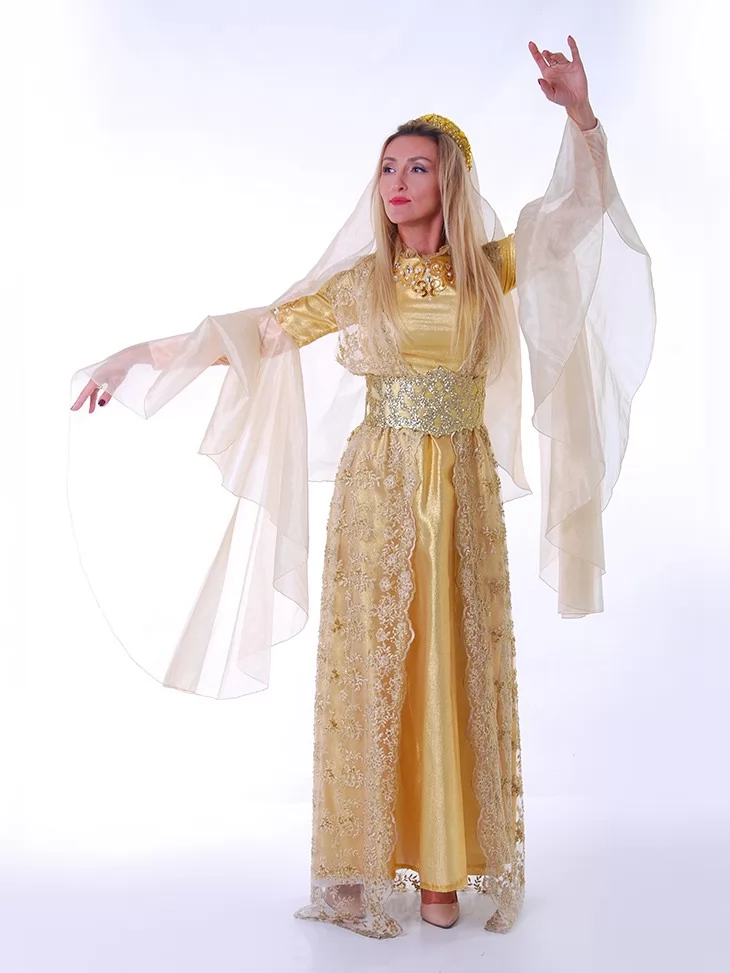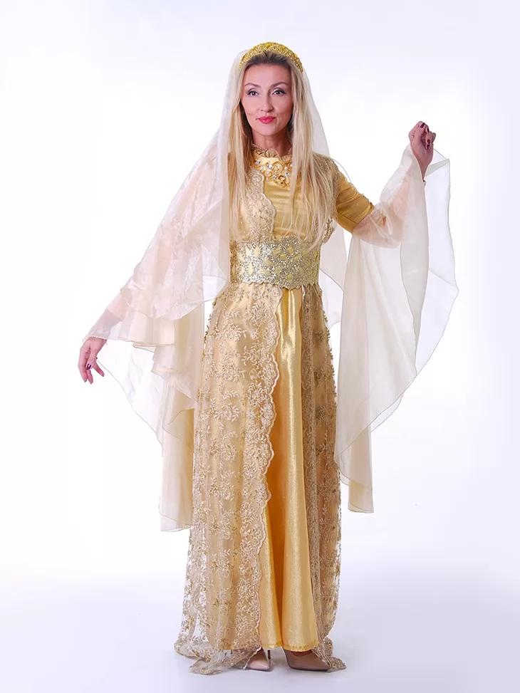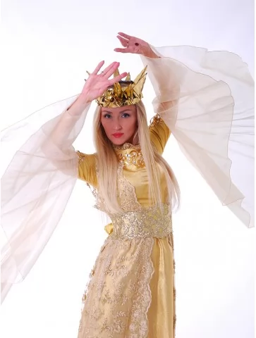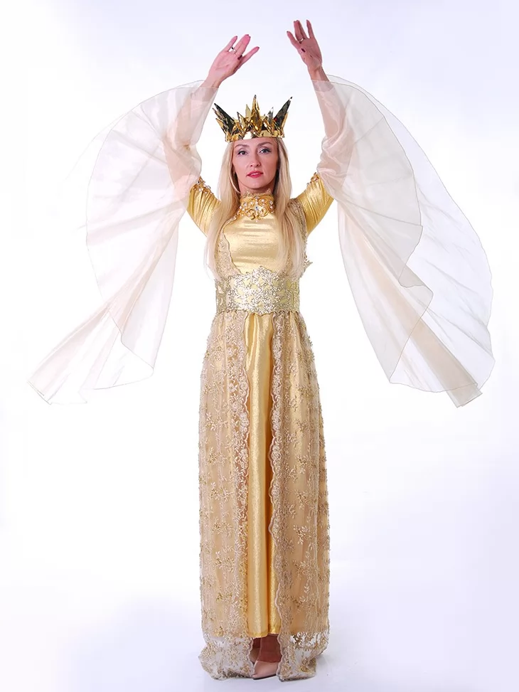 Цей костюм створений для тих, хто прагне перевтілитися у справжню героїню східної казки. Натхненний легендарною Роксоланою — дружиною султана Сулеймана Пишного, він поєднує елегантність, магнетизм і символіку влади. М’яка золота тканина струмує разом із кожним рухом, а пишні рукави й мереживна накидка додають жіночності та шарму. У такому вбранні ви не просто станете центром уваги — ви втілите дух епохи та культурної величі. Завдяки послузі оренда карнавальних костюмів, ви зможете на один вечір відчути себе султаною гарему.