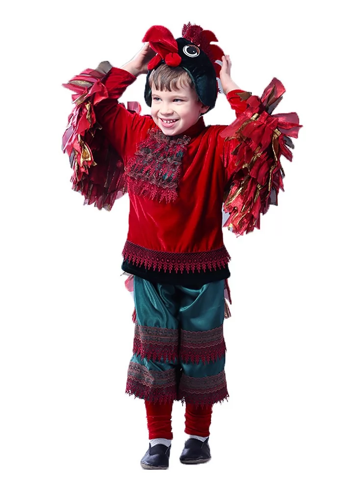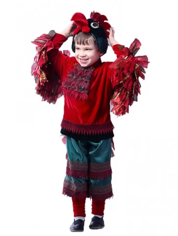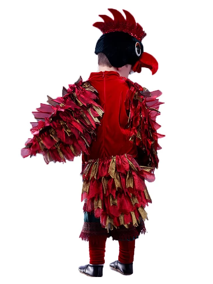 Цей барвистий та життєрадісний образ одразу асоціюється з народними казками, дитячими виставами та веселими святами. Насичені червоні й зелені відтінки, декоративні крила та характерна шапка створюють впізнаваний образ півника. Чудовий варіант для оренди карнавальних костюмів на ранки, виступи та тематичні події.