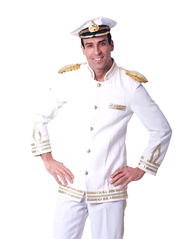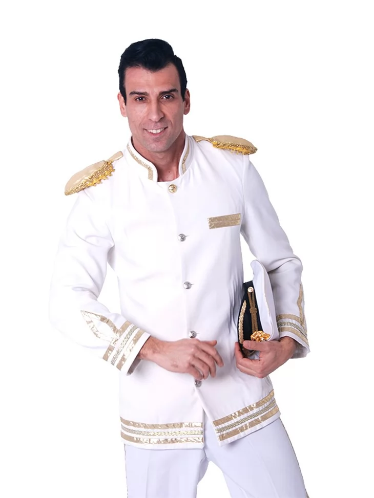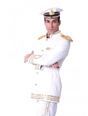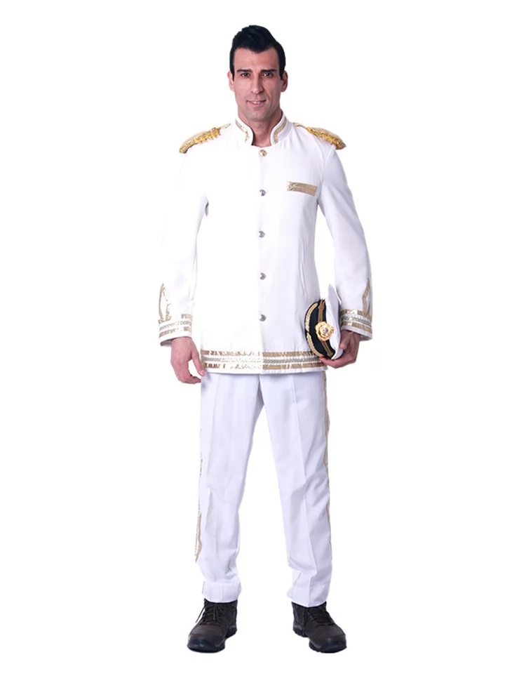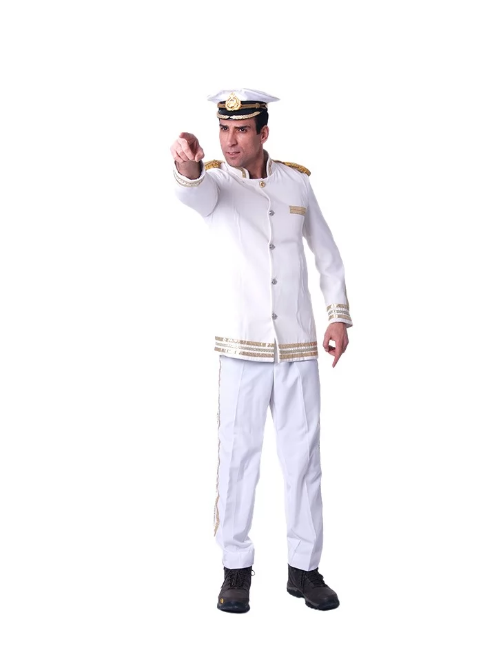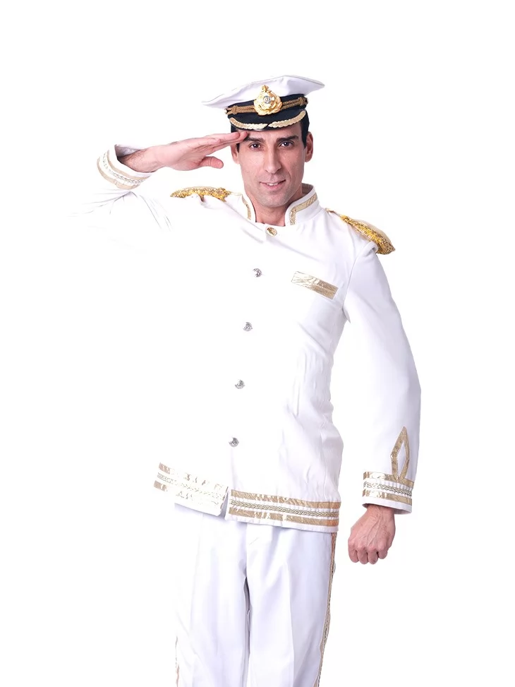 Цей статусний образ уособлює владу, впевненість і морську шляхетність. Білий парадний костюм із золотими акцентами формує впізнаваний образ капітана — людини, яка керує курсом, приймає рішення та завжди тримає ситуацію під контролем. Костюм ідеально підходить для оренди карнавальних костюмів на тематичні заходи, фотосесії та сценічні події.