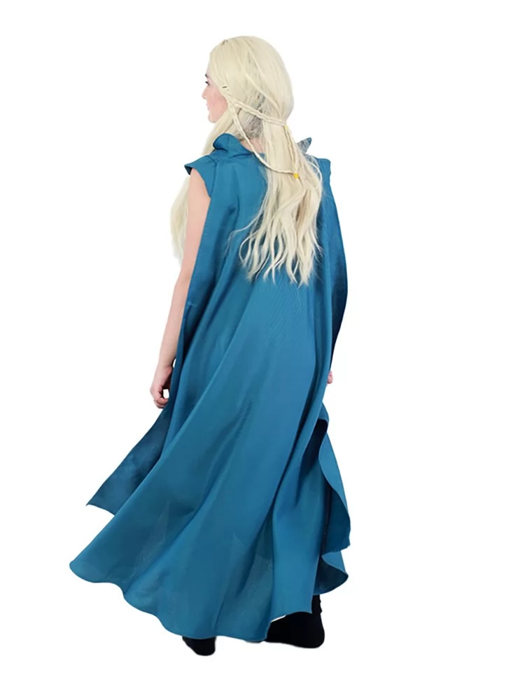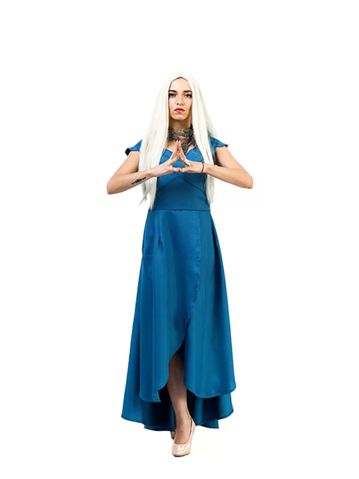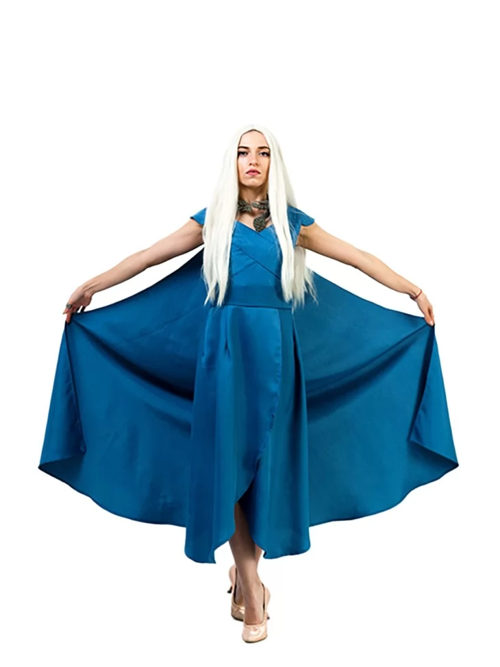 Костюм «Повелителька Драконів» натхненний образом легендарної героїні з саги «Гра престолів» — жінки, яка несе вогонь, силу і волю до свободи. Глибокий синій колір, асиметричний фасон та накидка, що струменить за плечима, створюють динамічний і впевнений образ, гідний королеви драконів. Цей костюм ідеально пасує для поціновувачів фентезі та епічних образів. Завдяки прокату карнавальних костюмів, перевтілитися в харизматичну Данерис тепер легко як ніколи.