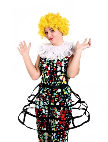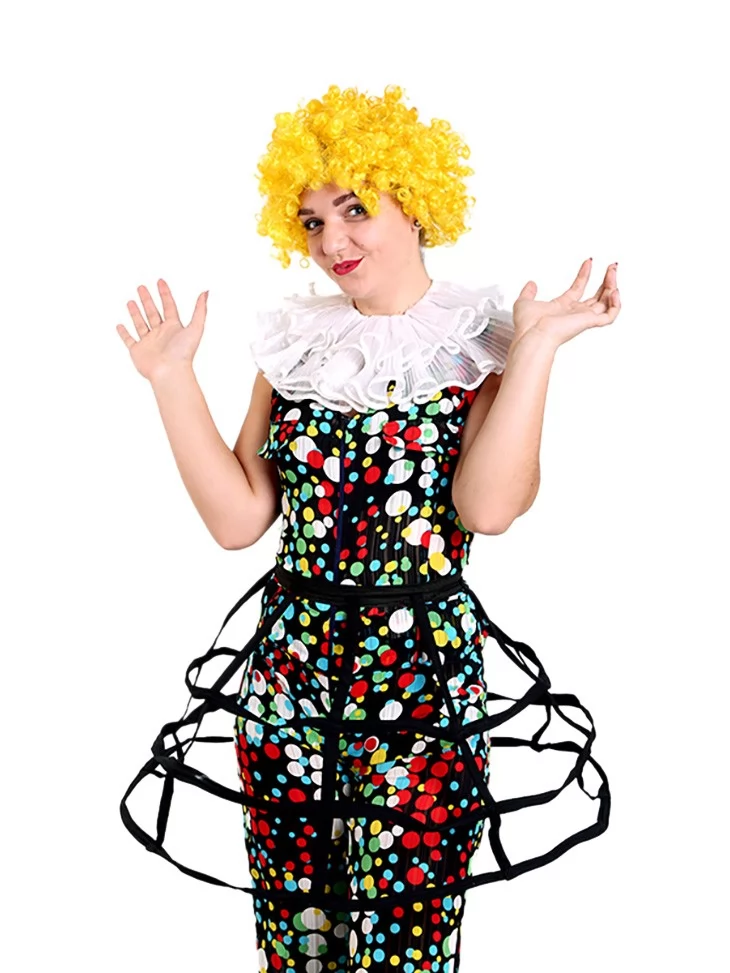 Яскравий, життєрадісний та неймовірно емоційний образ, що одразу створює атмосферу сміху, шоу та справжнього циркового дива. Барвистий комбінезон у різнокольоровий горошок виглядає святково, динамічно та дуже ефектно у русі. Цей образ чудово підходить для оренди карнавальних костюмів на вечірки, анімаційні програми, виступи та фотосесії, де важлива енергія радості та позитиву. Повітряний комір додає театральності, а яскрава перука завершує класичний цирковий стиль.