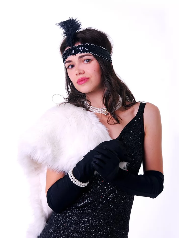 Елегантний, загадковий та витончено чуттєвий образ у стилі ретро 1920-х років — епохи джазових вечорів, сигаретного диму й сміливих жінок, які диктували власні правила. Лаконічна чорна сукня підкреслює силует, а контрастне світле хутро додає драматизму та сценічної глибини. Цей образ ідеально підійде для оренди карнавальних костюмів, коли хочеться створити стриманий, але дуже виразний ретро-настрій.