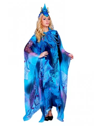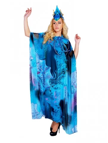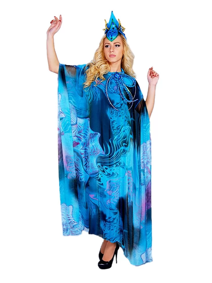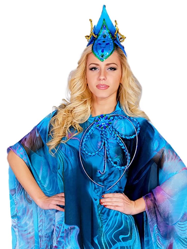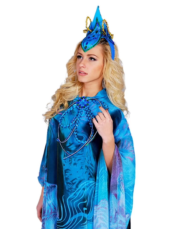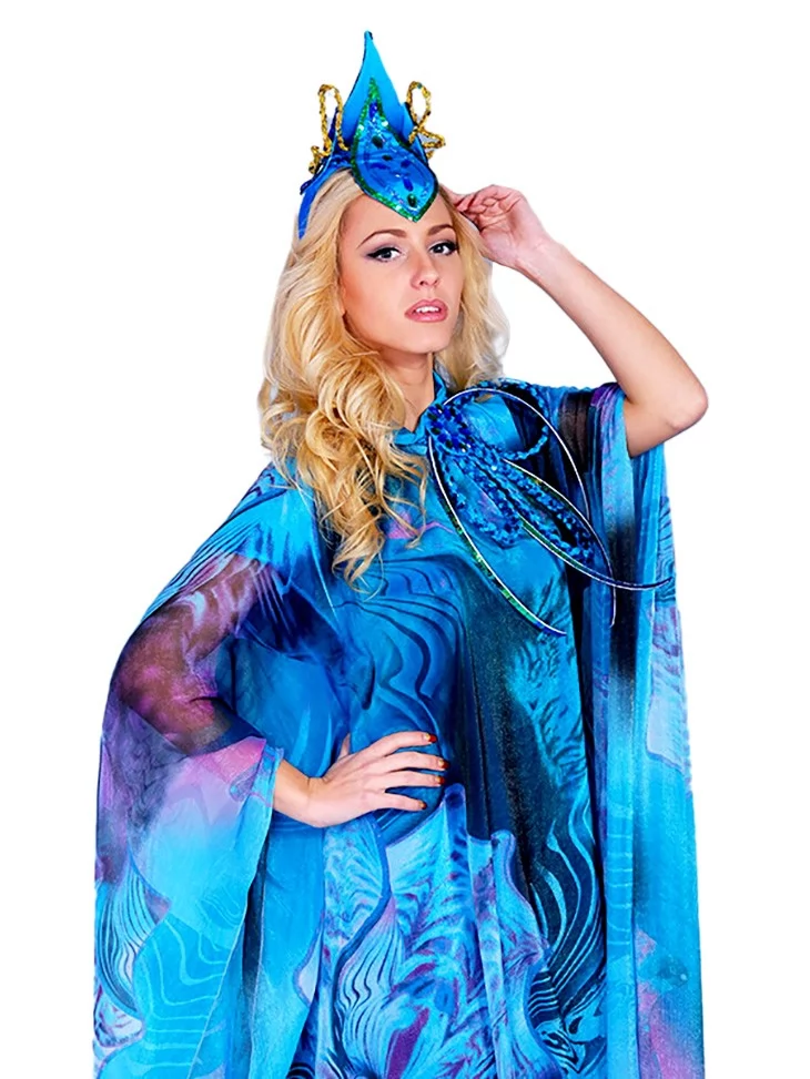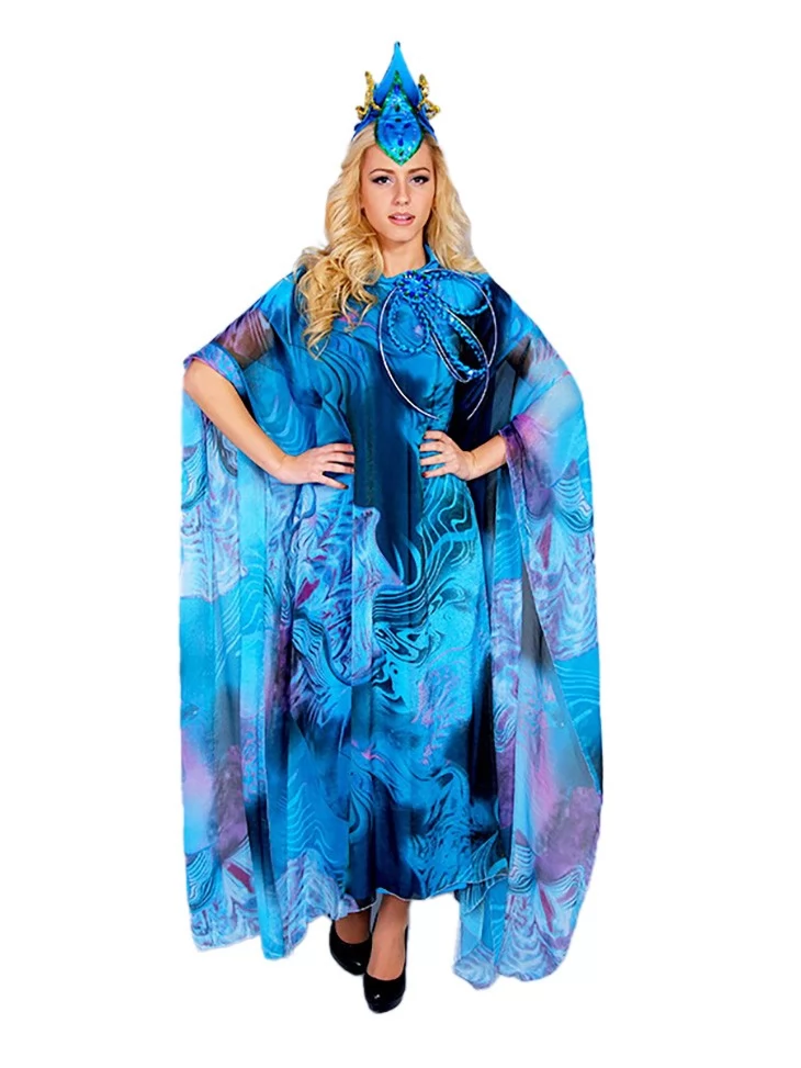 Цей величний образ уособлює силу океану, глибину водної стихії та загадкову красу морських легенд.Насичені відтінки синього й бірюзи, хвилеподібний принт і летючий силует створюють ефект руху води, ніби Морська Володарка виходить із самих глибин моря. Образ ідеально підходить для оренди карнавальних костюмів на сценічні події, шоу та тематичні вечірки.