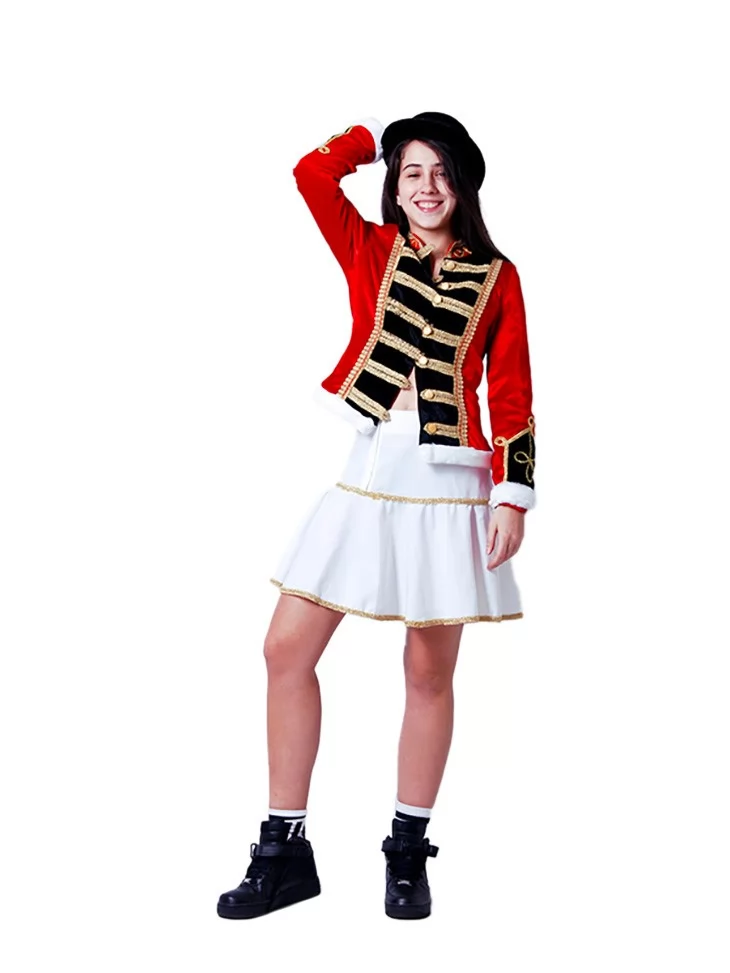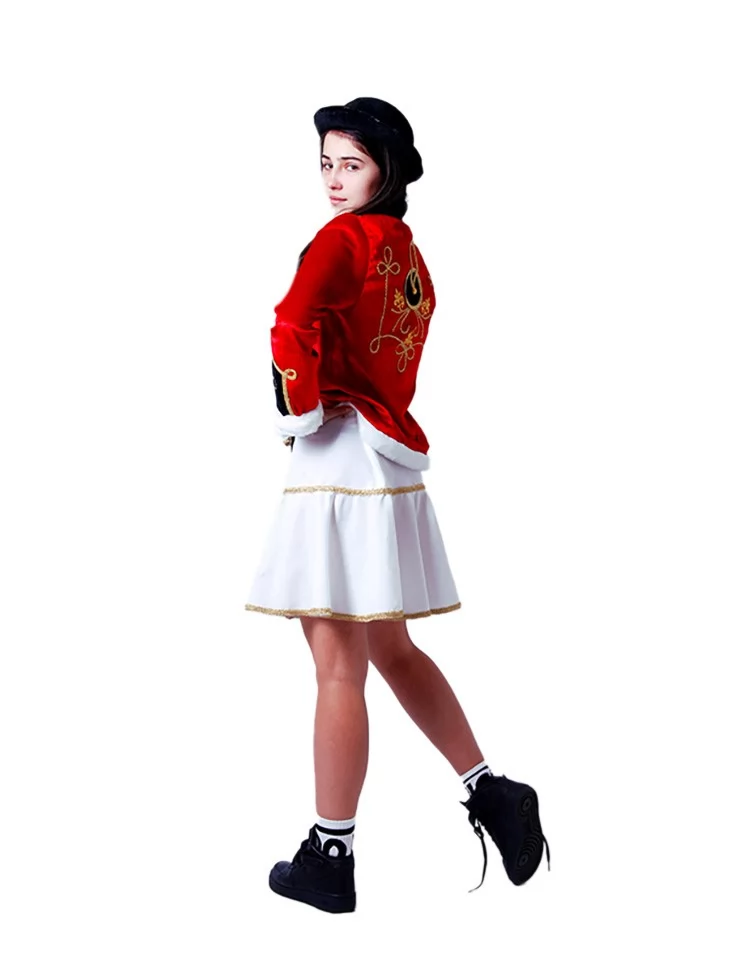 Яскравий, харизматичний та по-справжньому сценічний образ, що переносить у світ циркового шоу, оплесків і прожекторів. Червоний мундир із золотим оздобленням створює ефектну атмосферу манежу та додає впевненості кожному виходу. Цей костюм стане чудовим вибором для оренди карнавальних костюмів на тематичні вечірки, виступи, фотосесії або святкові події, де потрібен яскравий і впізнаваний образ у стилі цирк. Контраст червоного мундира та білої спідниці виглядає урочисто, динамічно й дуже фотогенічно.
