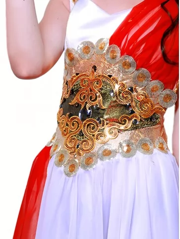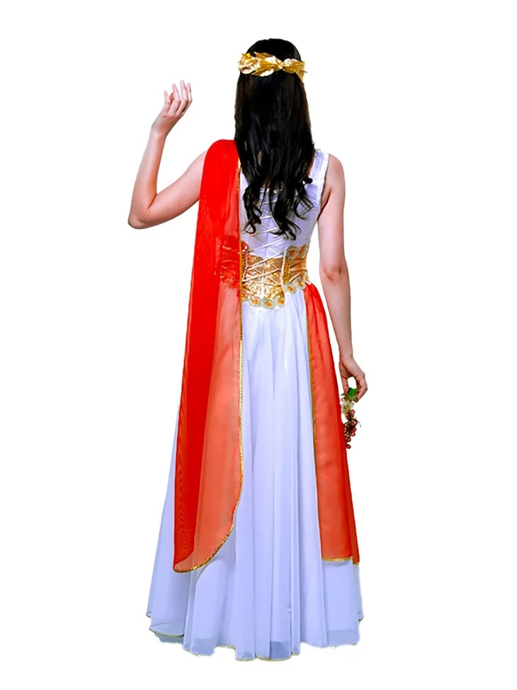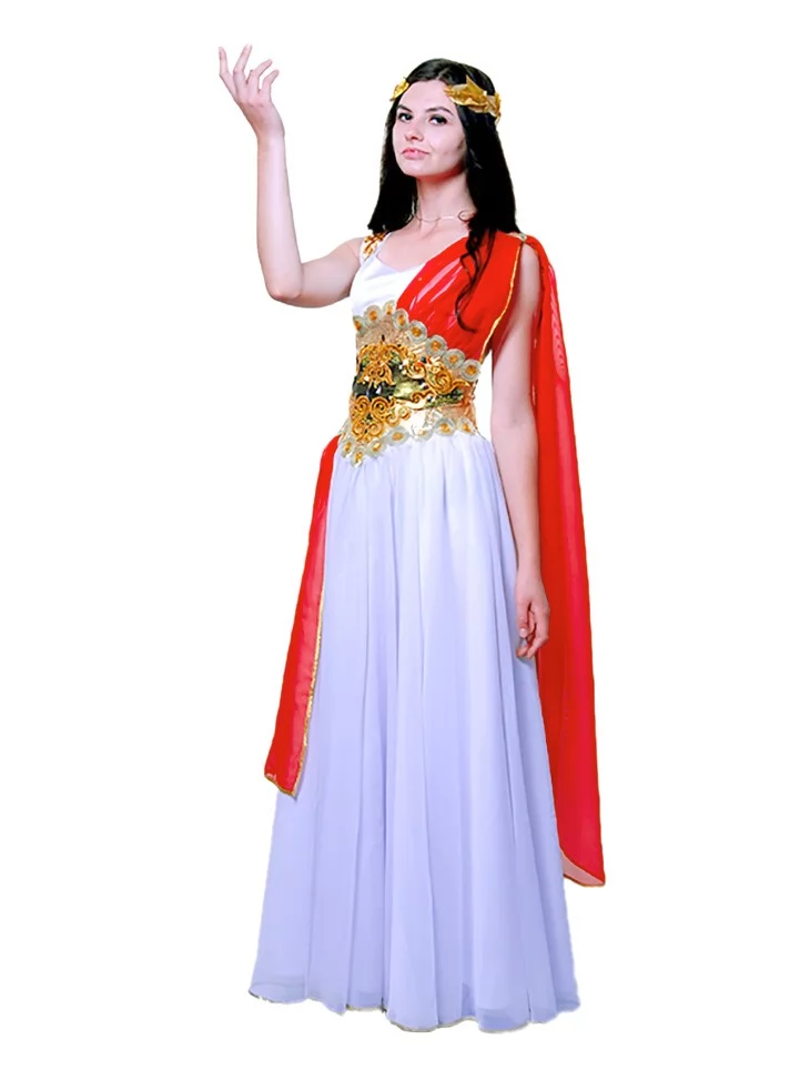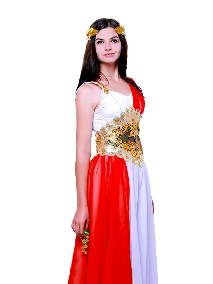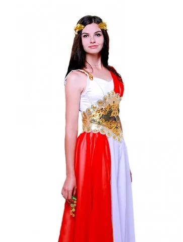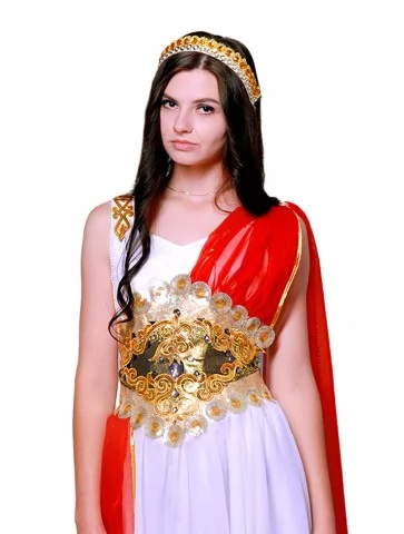 Костюм «Богиня Афіна» втілює рішучість, витонченість та грецьку монументальність. Біла шифонова сукня на шнурівці чудово підлаштовується під фігуру, створюючи водночас легкий та урочистий силует. Яскраво-червоний драпірувальний акцент додає енергії й сили, підкреслюючи стратегічну природу богині. Завершує образ золота вишивка на талії з орнаментом і вінок на голову. Завдяки послузі оренда карнавальних костюмів ви зможете приміряти образ наймудрішої з грецьких богинь.