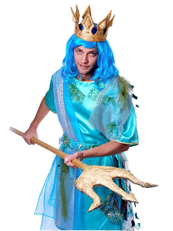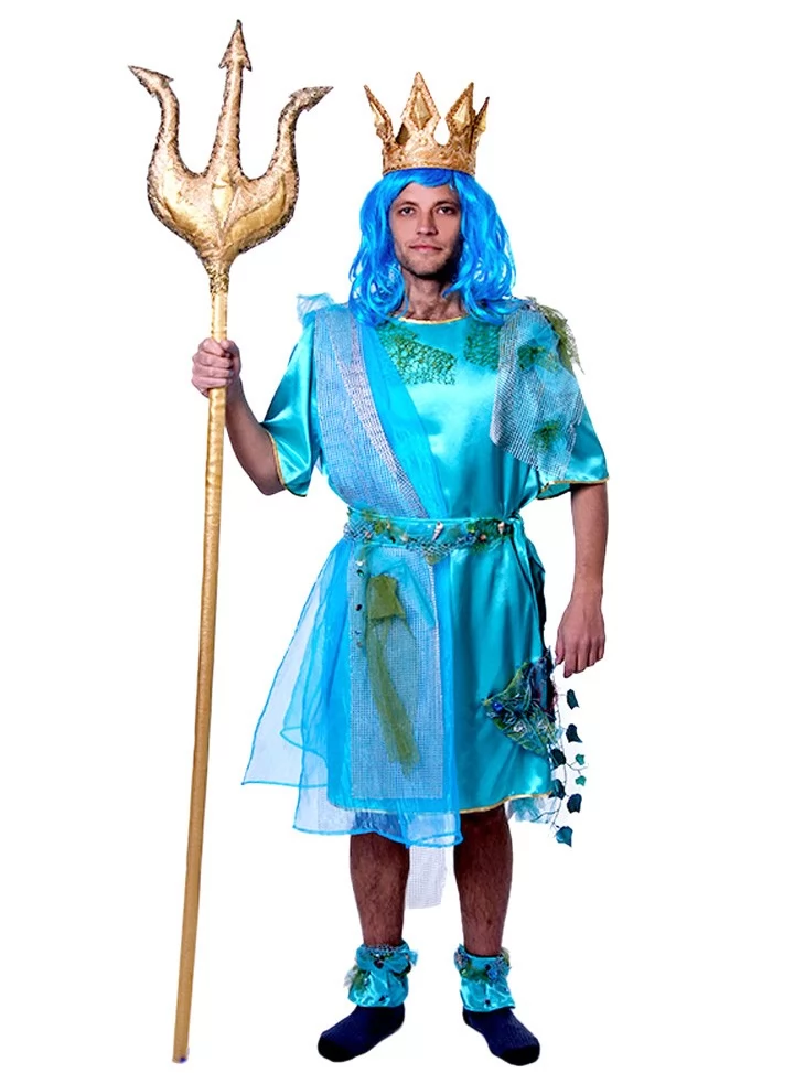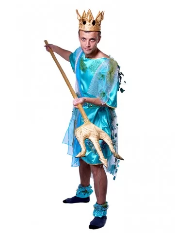 Цей яскравий фантазійний образ втілює силу океану, владу стихії та велич морського царства. Бірюзово-блакитна гама, напівпрозорі фактури й декоративні елементи, що нагадують водорості та хвилі, створюють впізнаваний силует володаря глибин — могутнього, загадкового й сценічно виразного. Образ чудово підходить для оренди карнавальних костюмів на шоу, тематичні події та виступи.