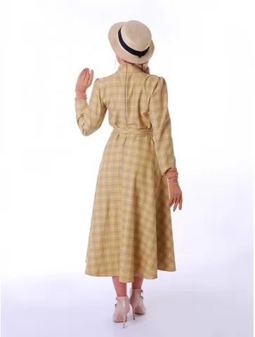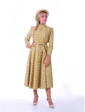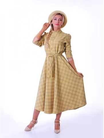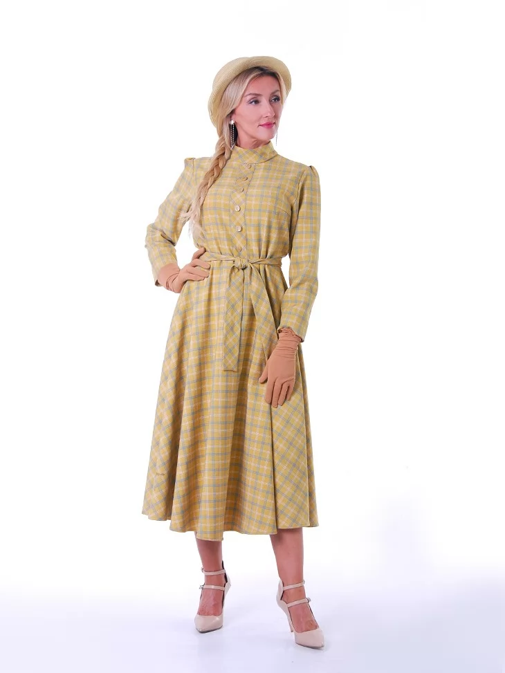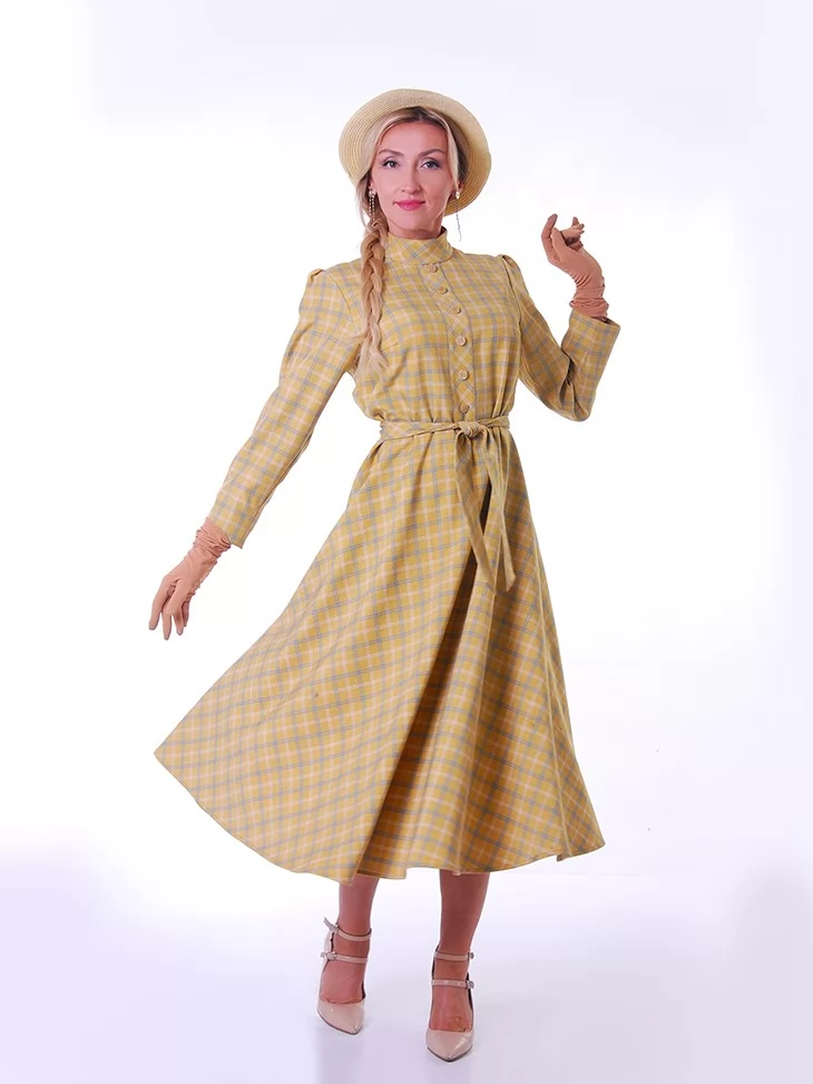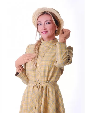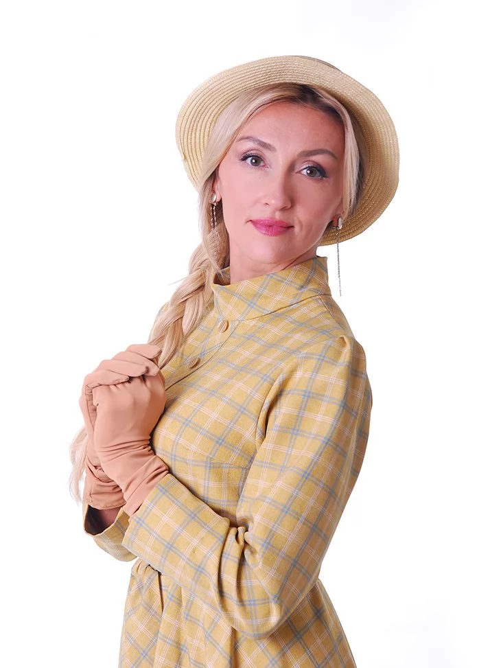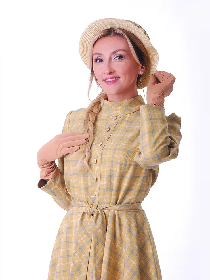 Цей ніжний образ у стилі New Look 1950-х років випромінює жіночність, стриману елегантність та легкий вінтажний настрій. Сукня у світлій клітинці з м’яким силуетом і акцентом на талії створює впізнавану естетику післявоєнної моди. Капелюшок додає образу завершеності та витонченого шарму. Це чудовий варіант для оренди карнавальних костюмів на фотосесії, ретро-заходи та тематичні події.