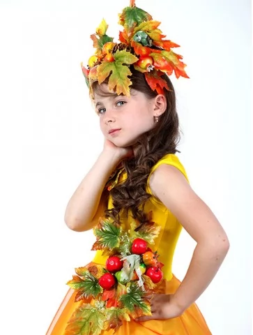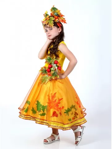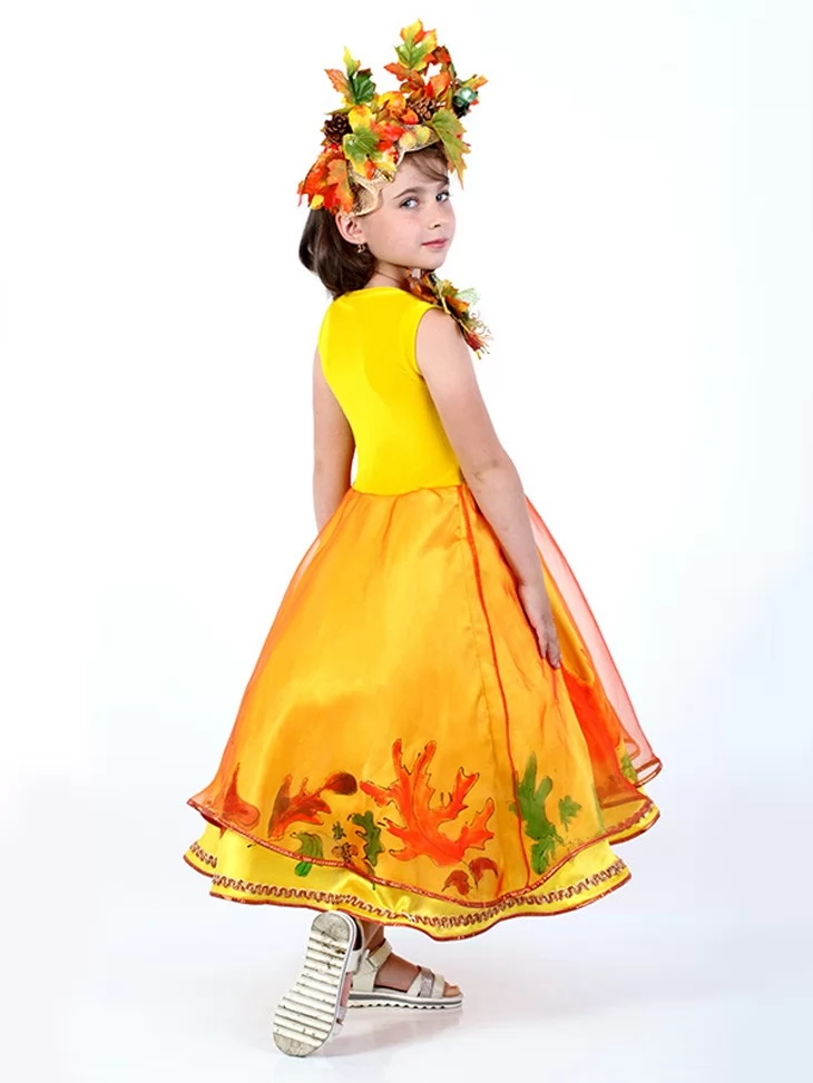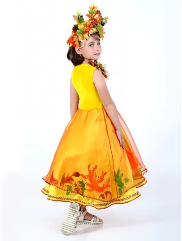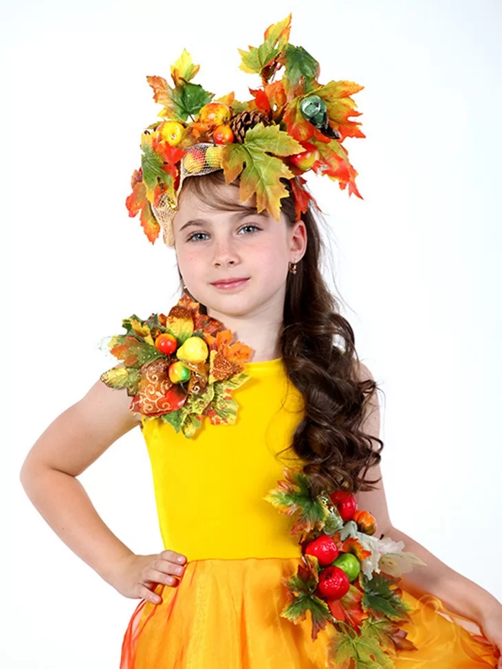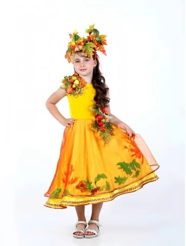 Теплий, сонячний образ, що втілює красу осінньої природи у всій її яскравості та щедрості. Жовто-помаранчева сукня з легкими прозорими шарами нагадує про золоте листя, теплий вітер і врожайні дні. Декор із листочків та плодів створює живий, святковий настрій і робить образ особливо виразним. Чудовий вибір для оренди карнавальних костюмів на осінні свята, ранки та тематичні заходи.