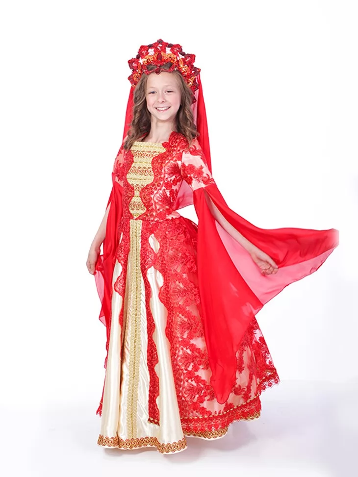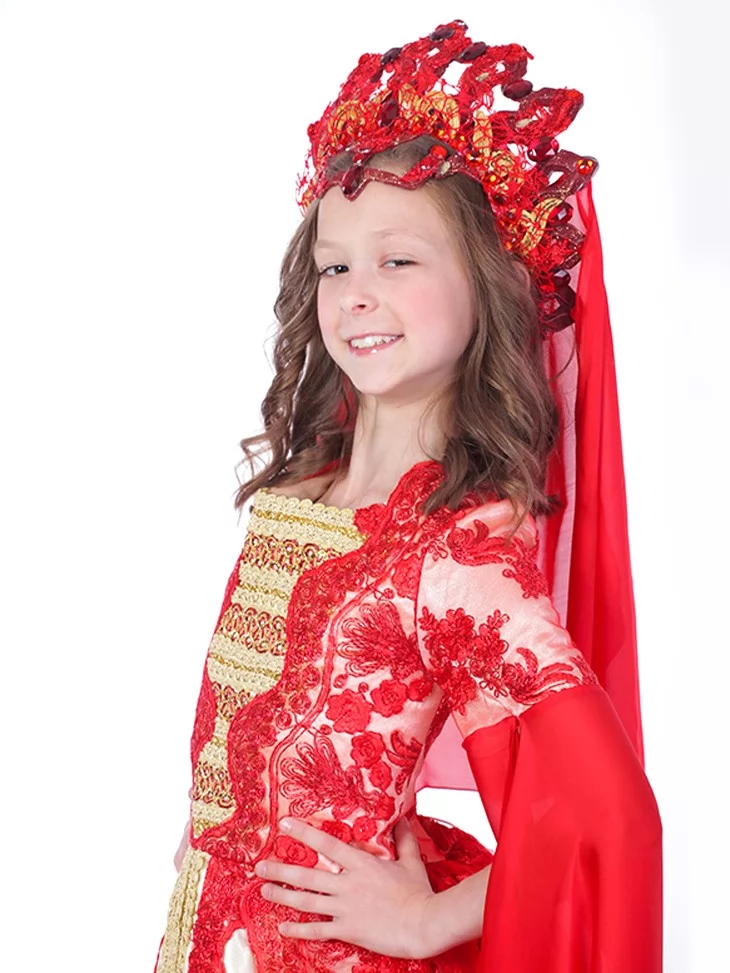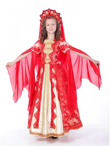 Розкішний та урочистий образ, натхненний атмосферою східних палаців, легенд і казок. Насичений червоний колір у поєднанні з золотими вставками та легкими прозорими рукавами створює ефект величі, магії та королівської присутності. Це вдалий вибір для оренди карнавальних костюмів на виступи, тематичні свята, фотосесії та сценічні номери.