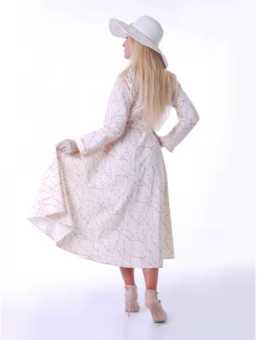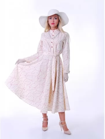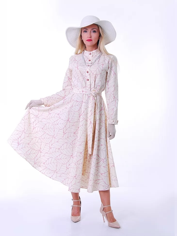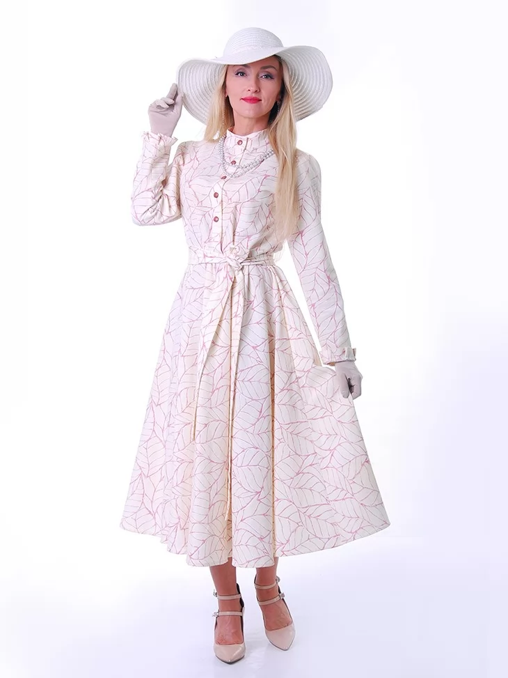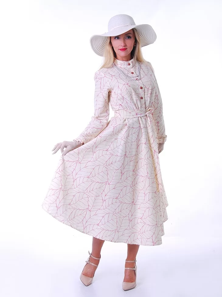Цей вишуканий образ у стилі New Look 50-х років виглядає легко, жіночно та надзвичайно елегантно. Молочна сукня з делікатним листяним візерунком красиво підкреслює фігуру, а акцент на талії формує характерний силует епохи. Широкополий капелюх, рукавички та намисто додають образу світського шарму й створюють атмосферу післявоєнної моди. Це чудовий вибір для оренди карнавальних костюмів на фотосесії, ретро-заходи та тематичні події.
