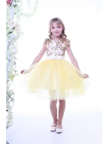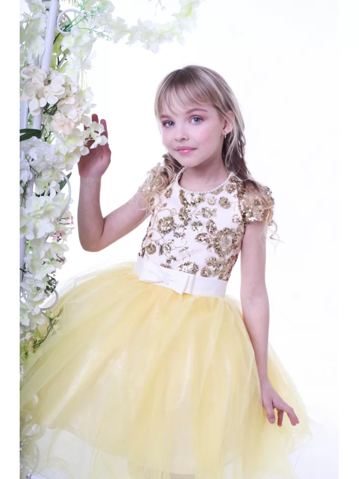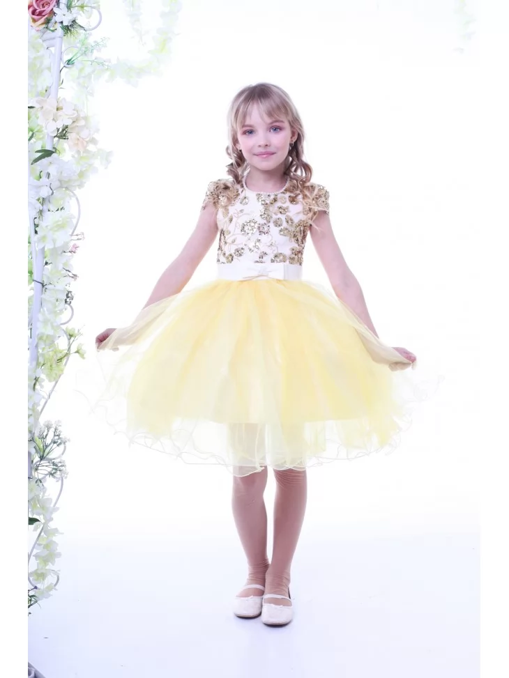 Сукня бальна Сонячна Іскра з золотим декором подарує яскравий настрій та стане чудовим рішенням для прокату карнавальних костюмів на будь-яке урочисте свято.