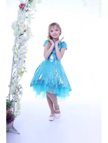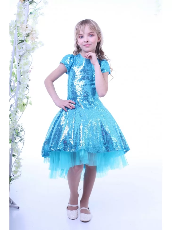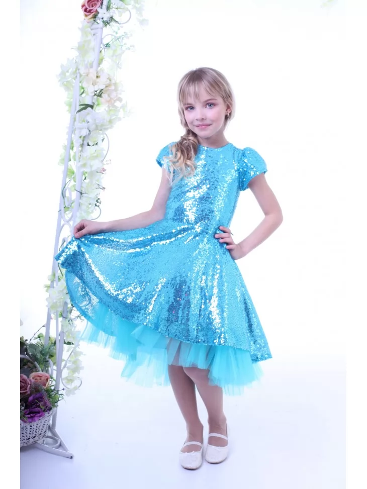 Яскравий святковий образ, що сяє при кожному русі та виглядає по-справжньому казково. Бірюзові паєтки красиво переливаються на світлі, а легка фатинова підкладка додає сукні об’єму й повітряності. Такий варіант ідеально підходить для оренди карнавальних костюмів на виступи, дні народження, фотосесії та святкові події, створюючи ефект справжньої маленької зірки.