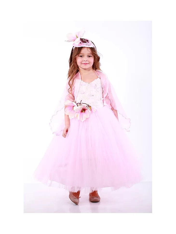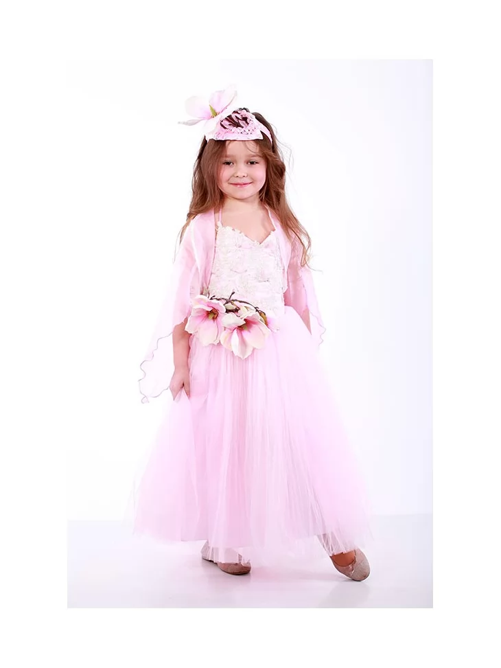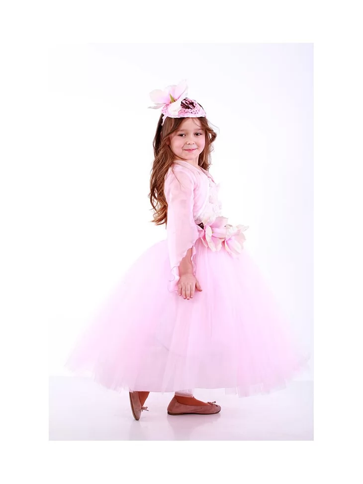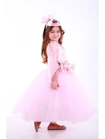 Легкий та витончений образ, що передає ніжність тропічної квітки й святкову казкову атмосферу. Повітряна довга сукня у ніжно-рожевих відтінках створює відчуття легкої хмаринки з пелюсток. Ажурний верх додає образу делікатності, а об’ємна квіткова композиція на талії підкреслює тему орхідеї та робить силует виразним. Прозора накидка й квітковий головний убір гармонійно завершують композицію. Цей варіант стане чудовим рішенням для оренди карнавальних костюмів на святкові ранки, виступи та фотосесії.