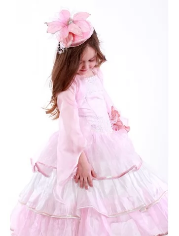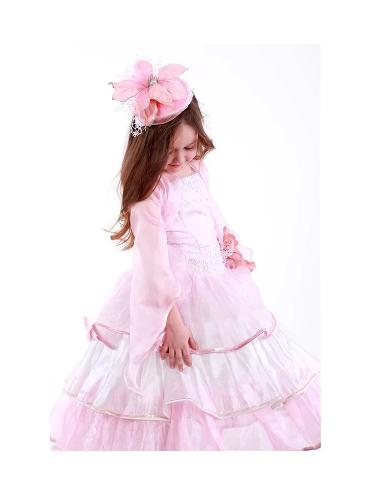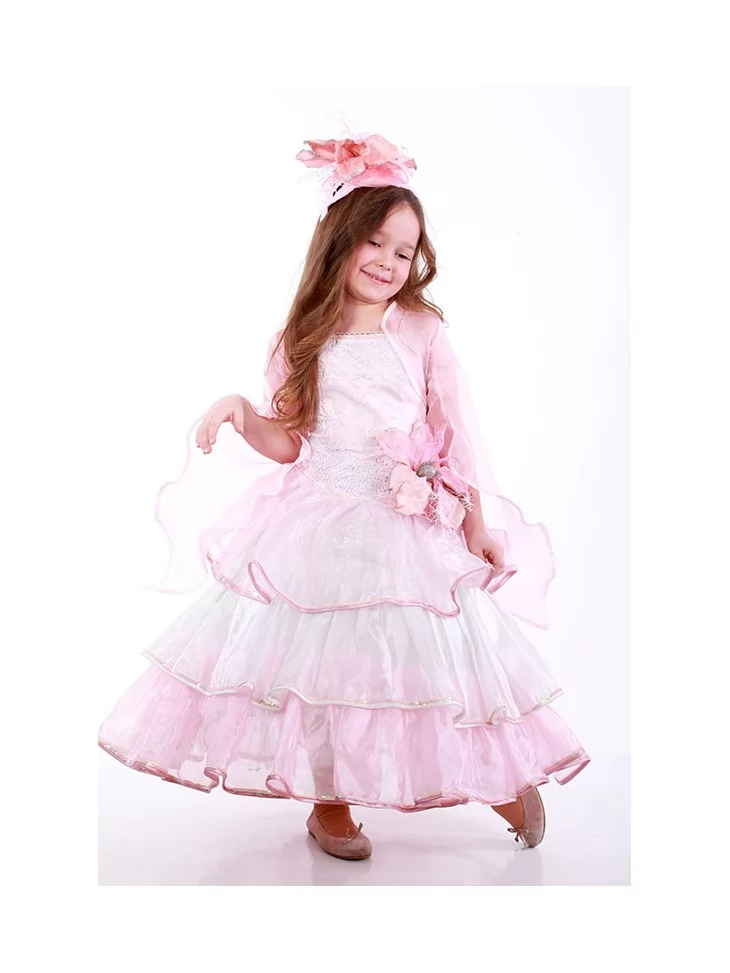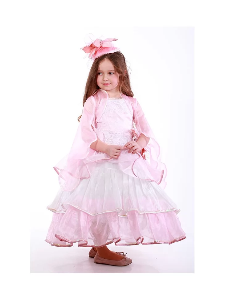 Витончений квітковий образ, сповнений легкості, ніжності пелюсток і казкової святкової елегантності. Повітряна сукня у ніжно-рожевій гамі з багатоярусною фатіновою спідницею створює ефект розквітлої орхідеї, легкої та граційної. Ажурний верх додає образу вишуканості, а декоративна квітка на талії та ніжний головний убір завершують квіткову композицію. Цей образ ідеально підходить для оренди карнавальних костюмів на весняні свята, виступи та чарівні фотосесії.