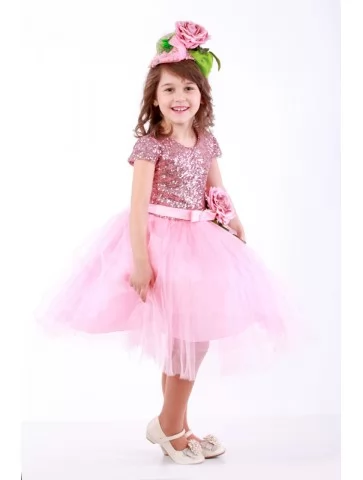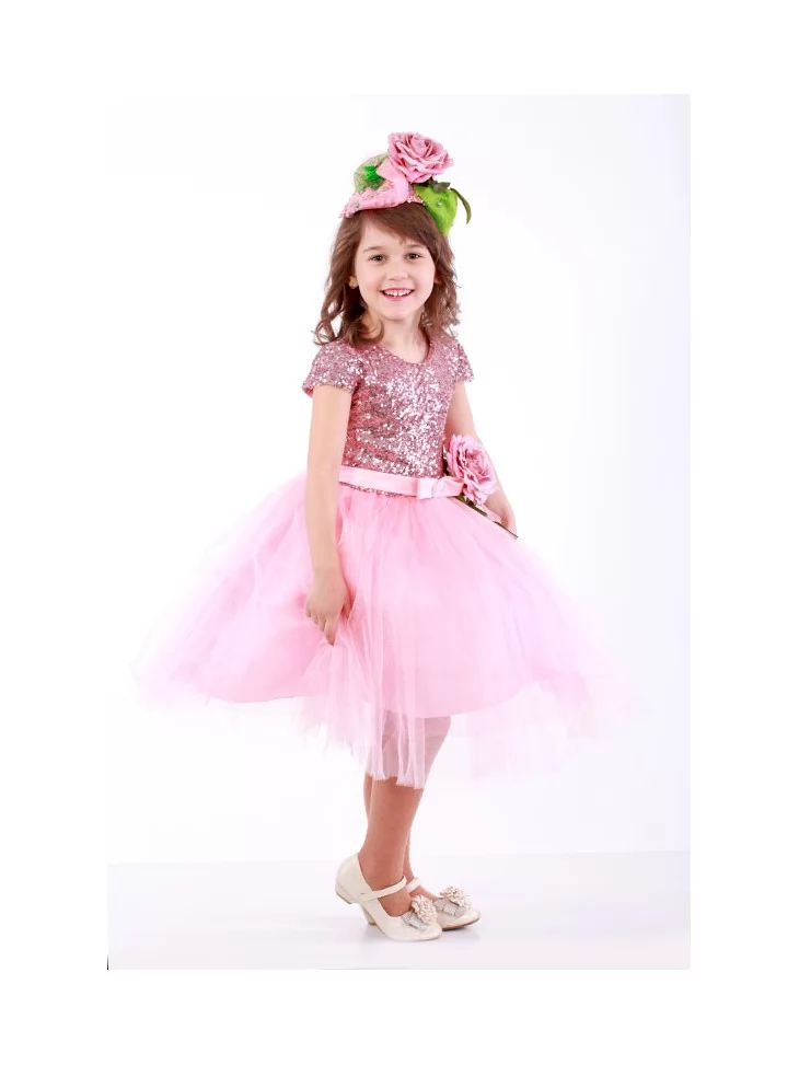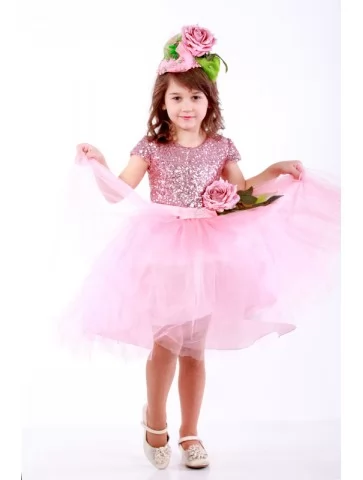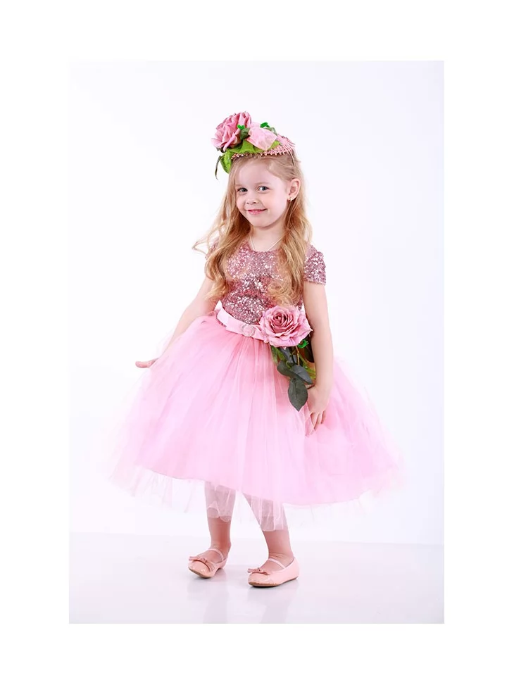 Світлий і витончений образ, що передає красу рожевої троянди, легкість пелюсток та святкову чарівність. Пишна фатінова спідниця ніжно-рожевого відтінку створює повітряний силует, а блискучий верх із паєтками додає образу святкового сяйва. Декоративна троянда на талії та акцентний квітковий головний убір гармонійно завершують композицію, підкреслюючи квіткову тематику. Це чудовий варіант для оренди карнавальних костюмів на весняні свята, виступи та фотосесії.