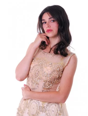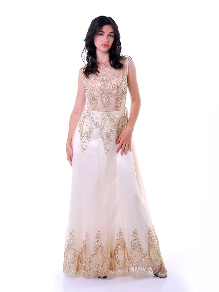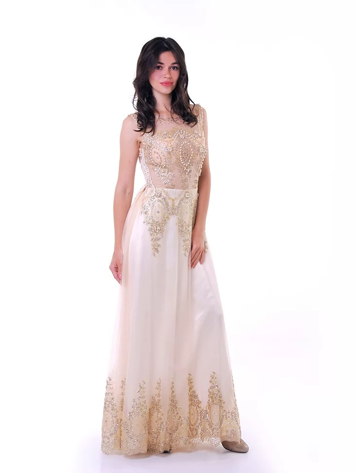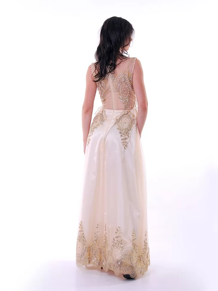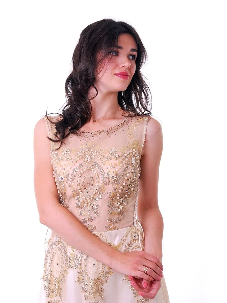 Вишукана та ніжна сукня, створена для моменту, який запам’ятовується на все життя. Світлий відтінок айворі у поєднанні з витонченим золотим декором надає образу святковості, легкості та справжньої елегантності. Це ідеальний варіант для оренда карнавальних костюмів, коли потрібна розкішна сукня на випускний, бал або урочисту подію.