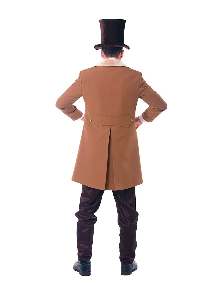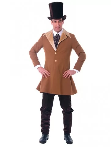 – довгий коричневий сюртук із широкими лацканами та золотими ґудзиками