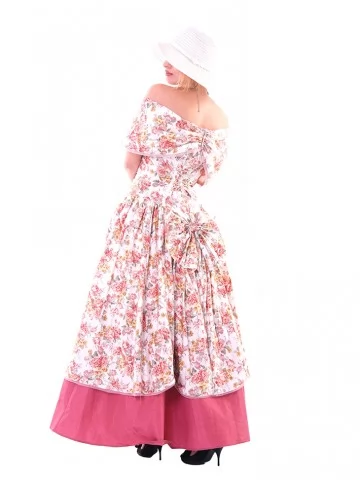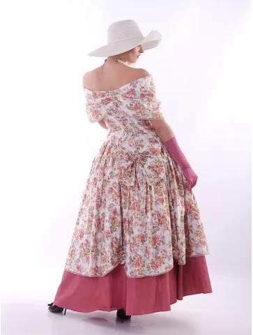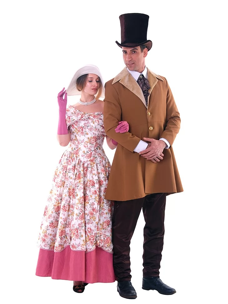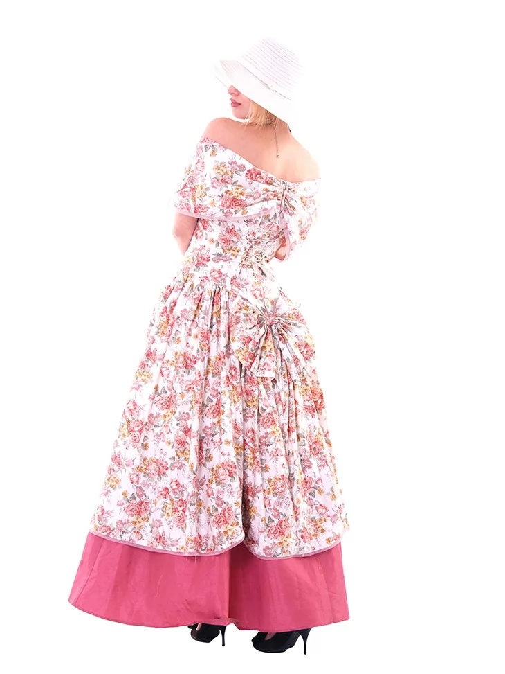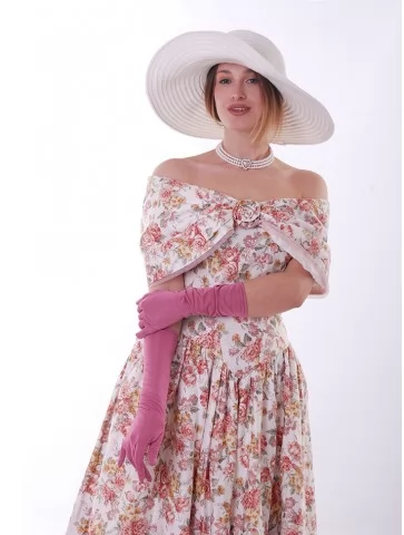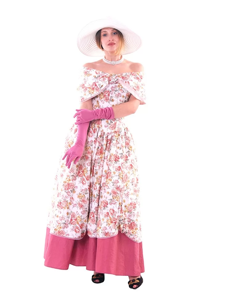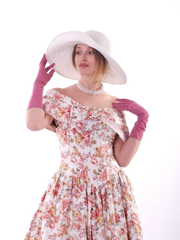 Цей ніжний образ у стилі 19 століття виглядає романтично, жіночно та дуже фотогенічно. Квіткова сукня з відкритими плечима створює легкий настрій літньої прогулянки, а широкий капелюшок і довгі рукавички додають витонченості, як у справжньої пані з аристократичних історій. Це прекрасний варіант для оренди карнавальних костюмів на фотосесії, тематичні події, бали чи виступи.