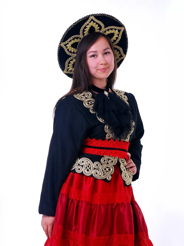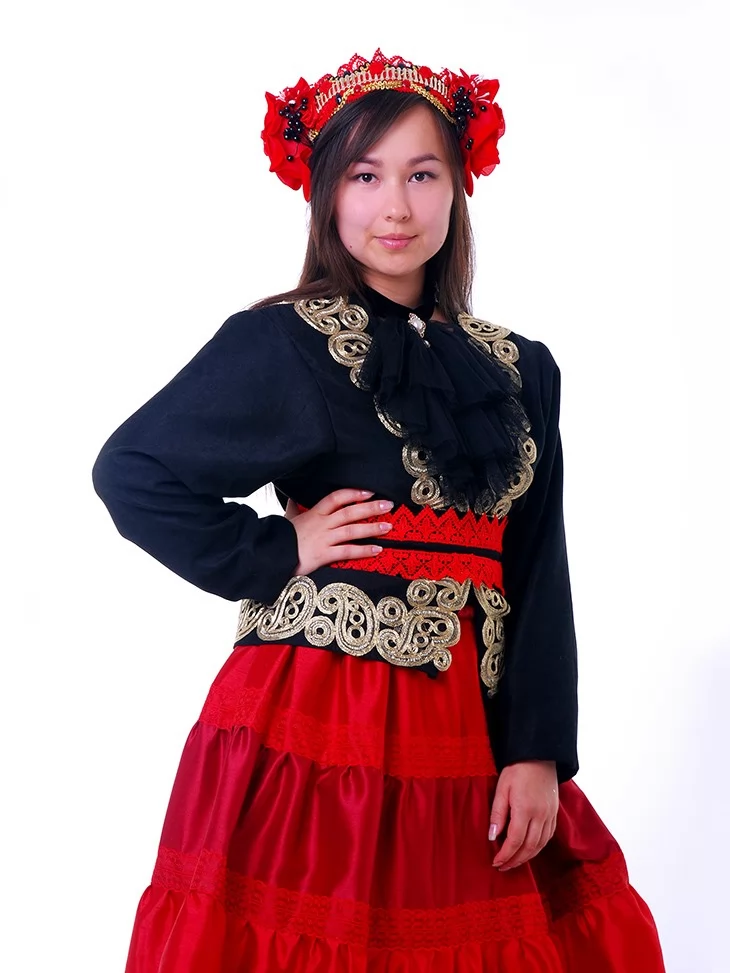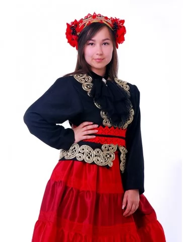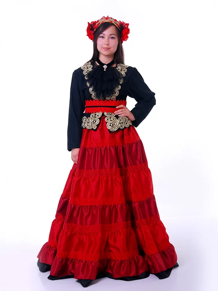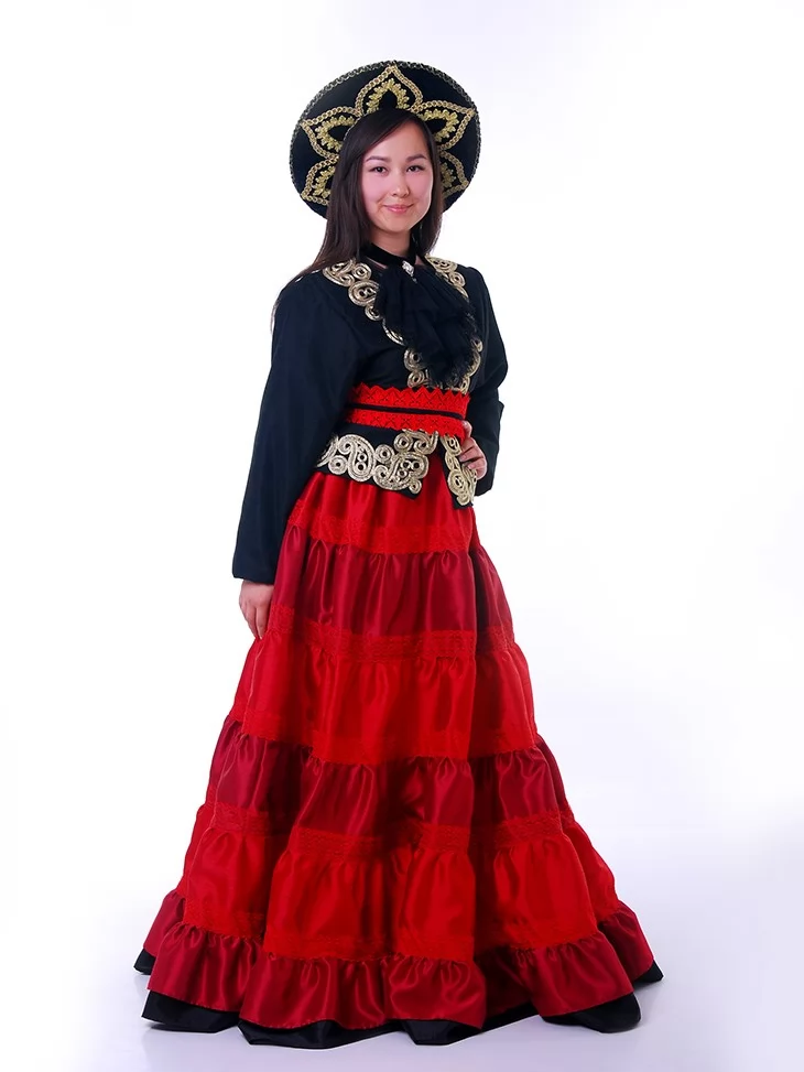 Цей костюм мексиканки поєднує багатство деталей, яскравість кольору та національну естетику. Пишна червона спідниця, розшитий чорний камзол із золотистою тасьмою, акцентне чорне жабо та пояс із червоним мереживом формують образ, що ідеально пасує до фестивалів, етнофотосесій і виступів. Завдяки послузі оренда карнавальних костюмів, кожен може перевтілитись у мексиканську сеньйору з яскравим характером.