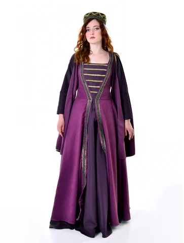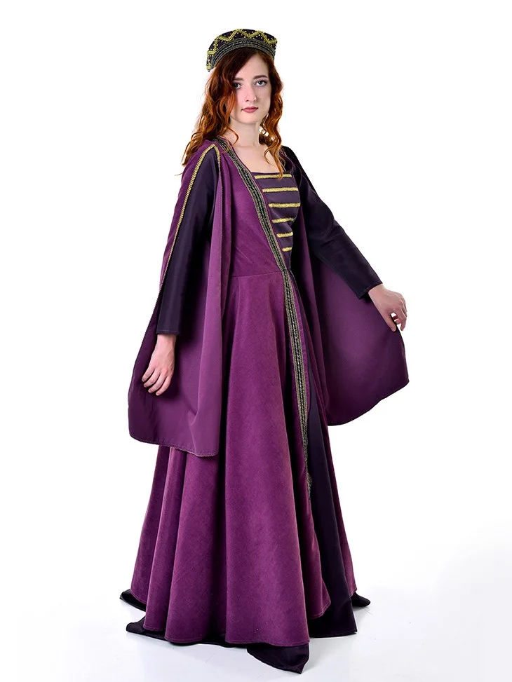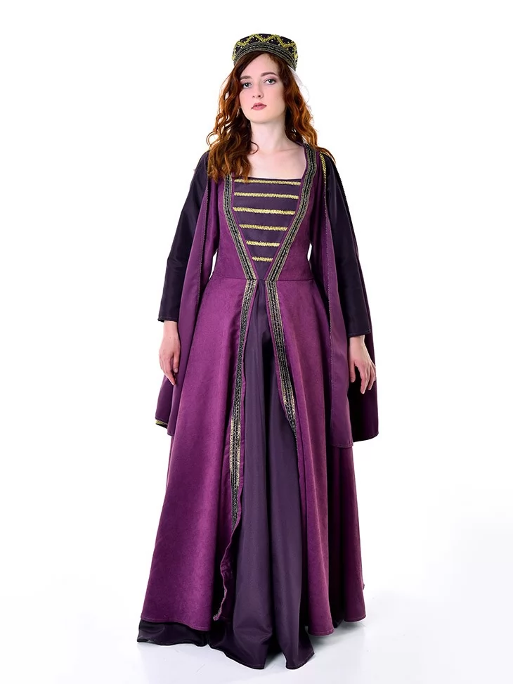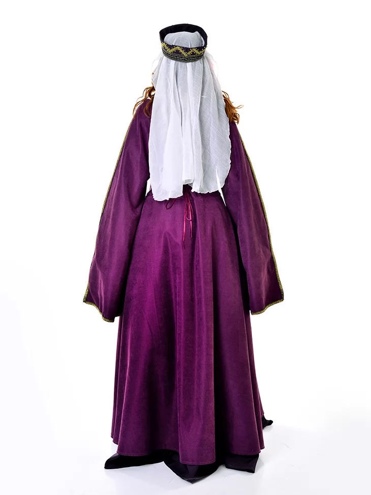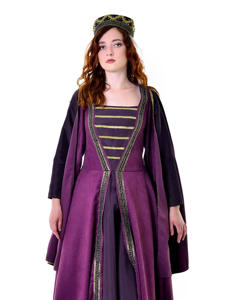 Цей костюм натхнений традиційним жіночим вбранням Грузії. Темні сливові відтінки, характерний головний убір створюють цілісний і вишуканий образ. У ньому поєднуються культурна глибина та сценічна виразність — він ідеально підходить для урочистих подій, фотосесій або виступів. Завдяки послузі оренда карнавальних костюмів, приміряти цей етнічний образ стало просто.