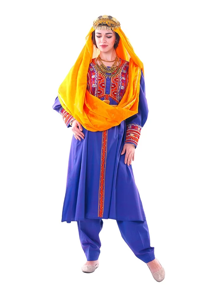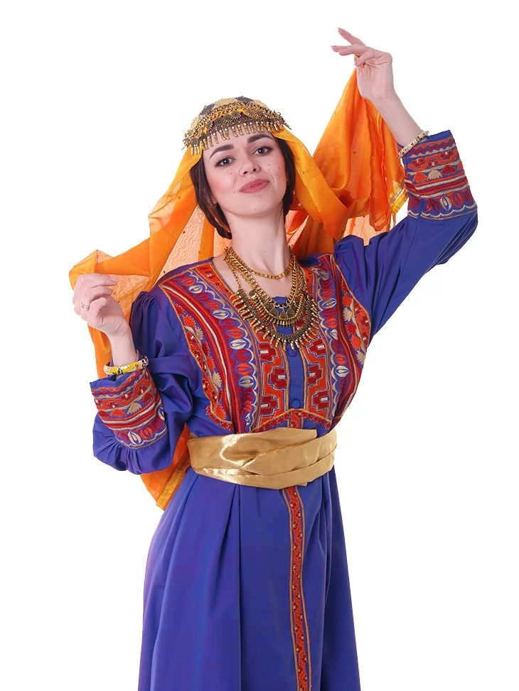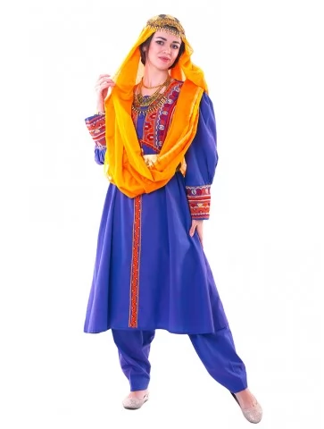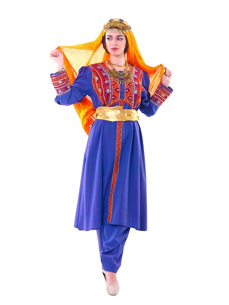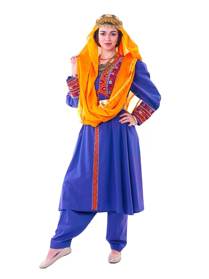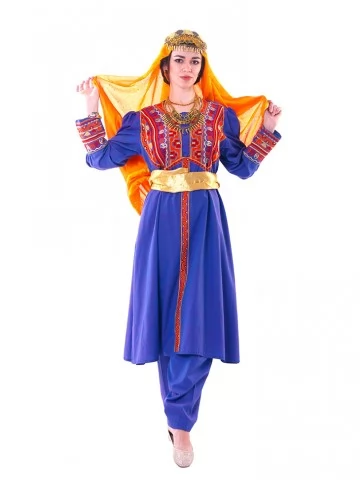 Костюм Принцеса у Сапфіровому вбранні поєднує у собі виразну вишивку, насичені кольори та ефектну багатошаровість. У цьому образі зібрані характерні елементи традиційного східного вбрання — від туніки з декоративними рукавами до вишуканої шалі та масивного намиста. Такий костюм легко адаптується до тематичних заходів завдяки послузі оренда карнавальних костюмів.