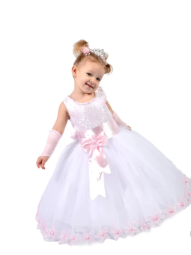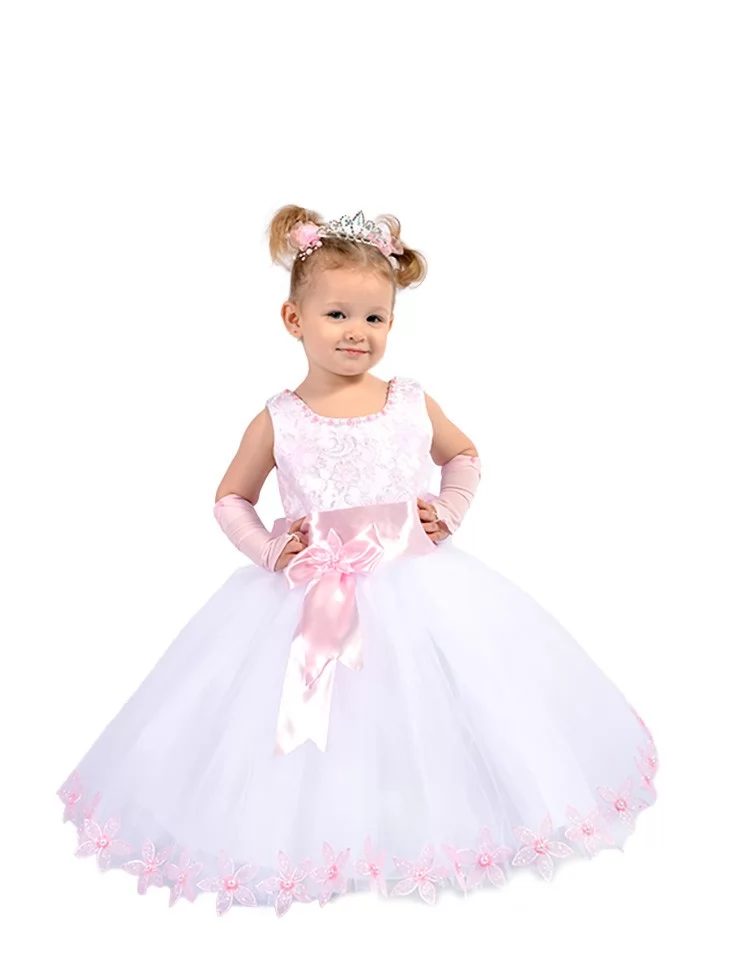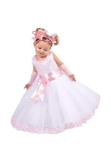 Ніжний і по-справжньому казковий образ маленької принцеси, сповнений світла, легкості та святкової чарівності. Мереживний молочний верх гармонійно поєднується з пишною тюлевою спідницею, прикрашеною витонченими квітковими акцентами по краю, а атласний рожевий пояс із бантом додає образу особливої ніжності. Ця сукня стане чудовим вибором для оренди карнавальних костюмів на ранки, фотосесії, дні народження та урочисті події.