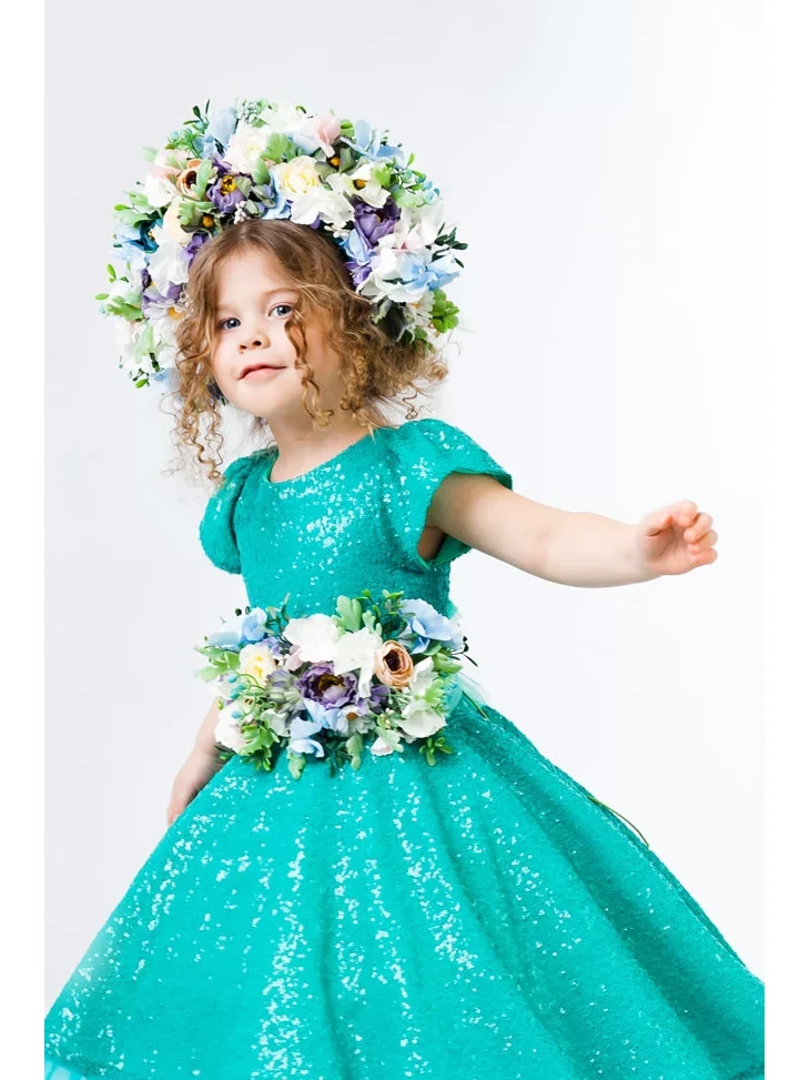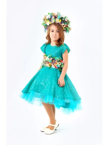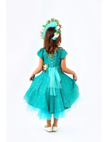Вишуканий та яскравий образ весни, що поєднує ніжність квітів і свіжість молодої зелені з витонченим бірюзовим відтінком. Легка блискуча сукня з пишною спідницею створює святковий силует, а об’ємний квітковий пояс і розкішний віночок наповнюють образ природною гармонією. Ідеальний варіант для оренди карнавальних костюмів на весняні ранки, фотосесії та тематичні виступи.