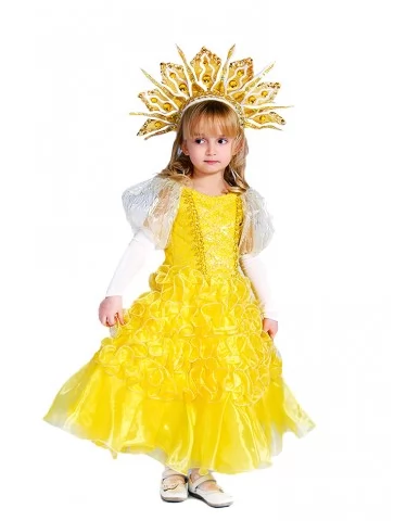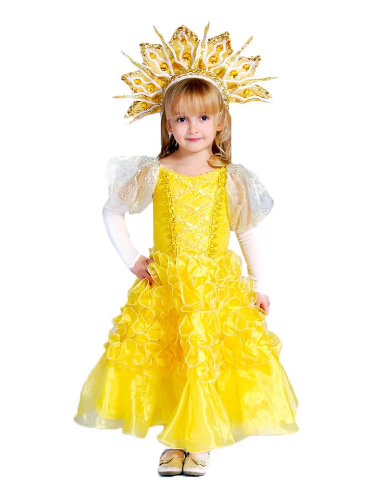 Яскравий та радісний образ, що уособлює тепле сонячне світло, дитячу енергію та святковий настрій.Насичена жовта сукня з об’ємним декором і розкішний головний убір у вигляді сонячних променів створюють ефект справжнього сяйва. Такий образ виглядає дуже урочисто та чудово підходить для оренди карнавальних костюмів на дитячі виступи, свята та фотосесії.