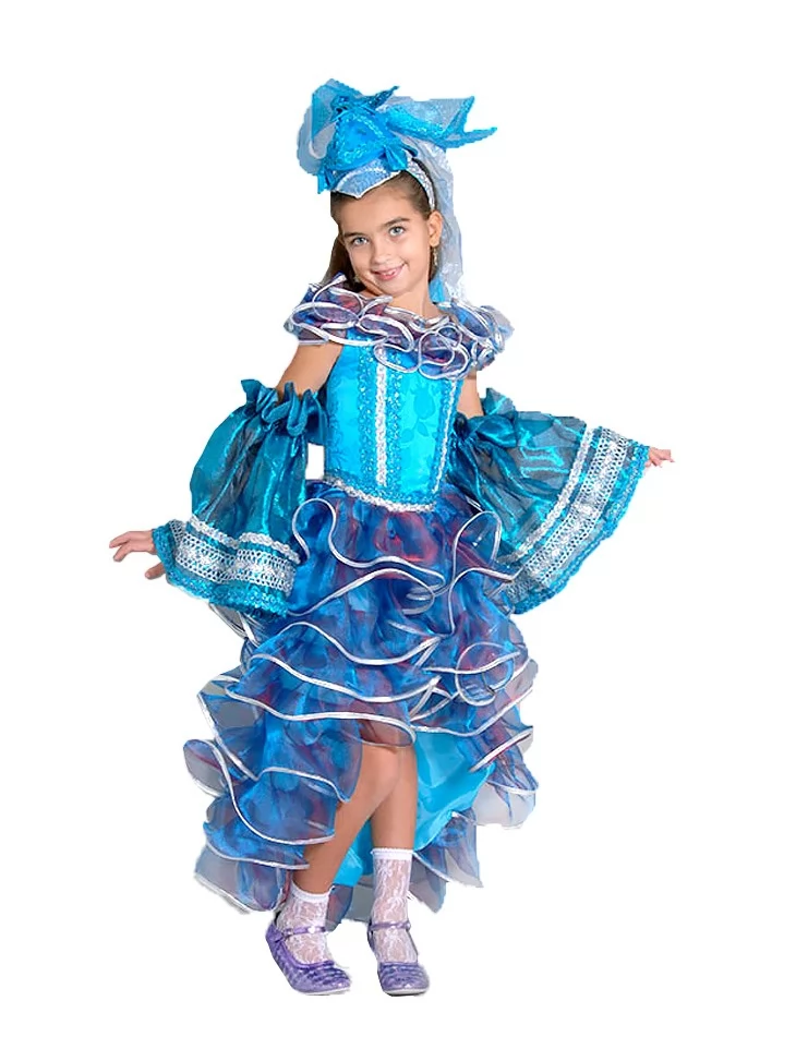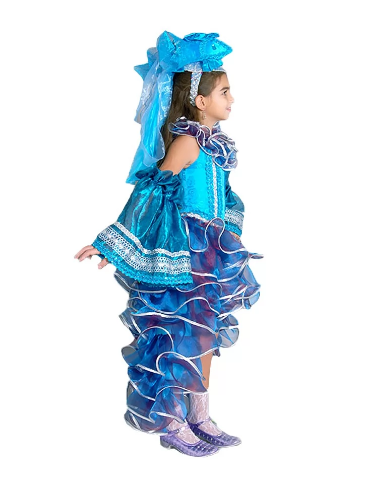 Яскравий та казковий образ морської рибки, що ніби виплив із глибини чарівного океану. Блакитні відтінки тканини, хвилясті оборки та блискучі декоративні елементи створюють ефект руху води та мерехтіння морських хвиль. Такий костюм стане чудовим варіантом для оренди карнавальних костюмів на виступи, святкові події та казкові постановки.