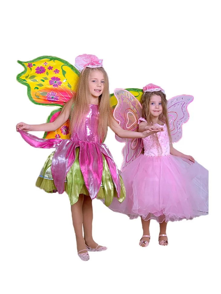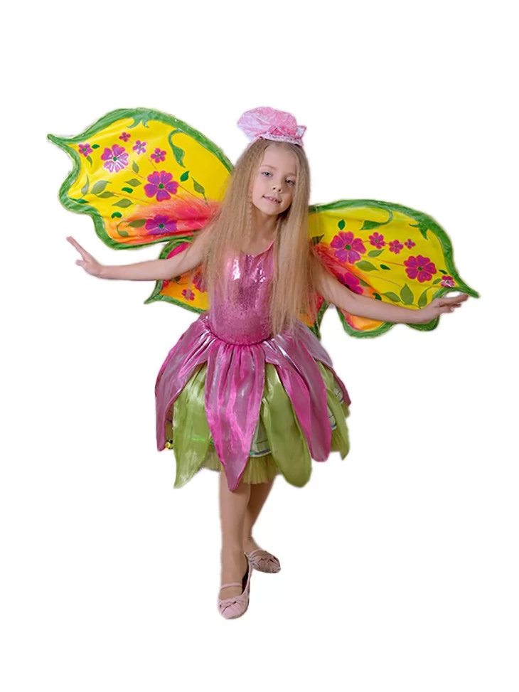 Яскравий казковий образ, у якому розквітає фантазія, кольори та справжня магія весни. Цей ефектний костюм феї виглядає мов жива квітка серед сонячного саду — блискучий рожевий корсет, багатошарова спідниця у формі пелюсток та великі жовто-квіткові крила створюють неймовірно святковий і динамічний силует. Образ ідеально підходить для оренди карнавальних костюмів на дитячі свята, фотосесії та весняні ранки, де хочеться справжнього чарівництва й яскравих емоцій.