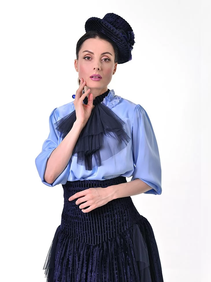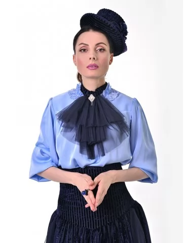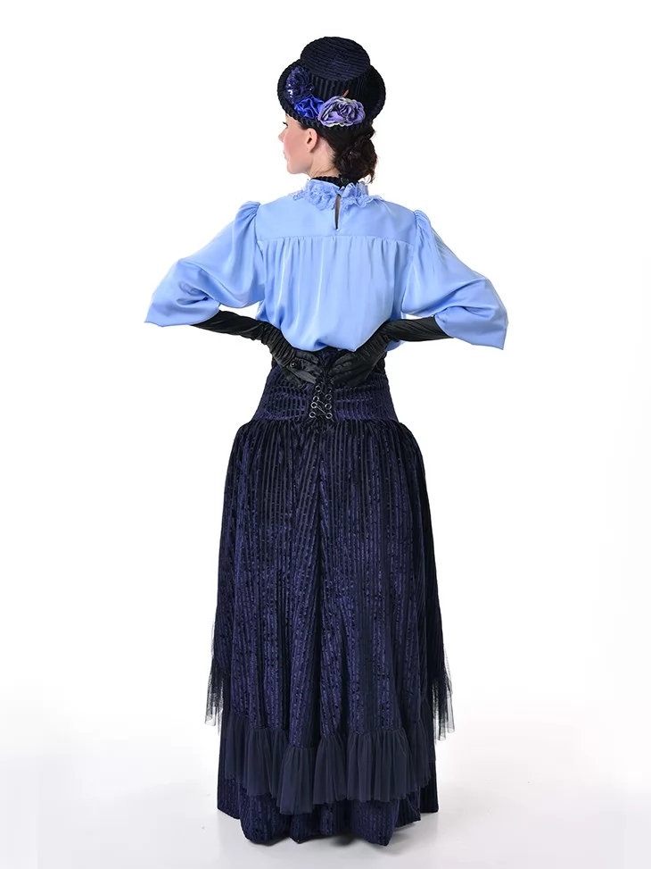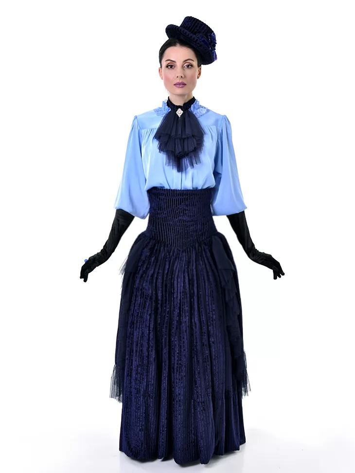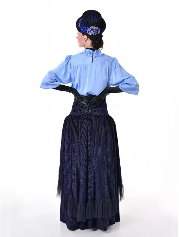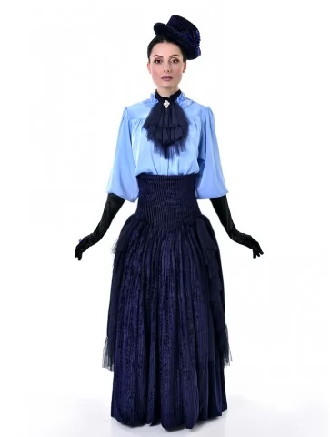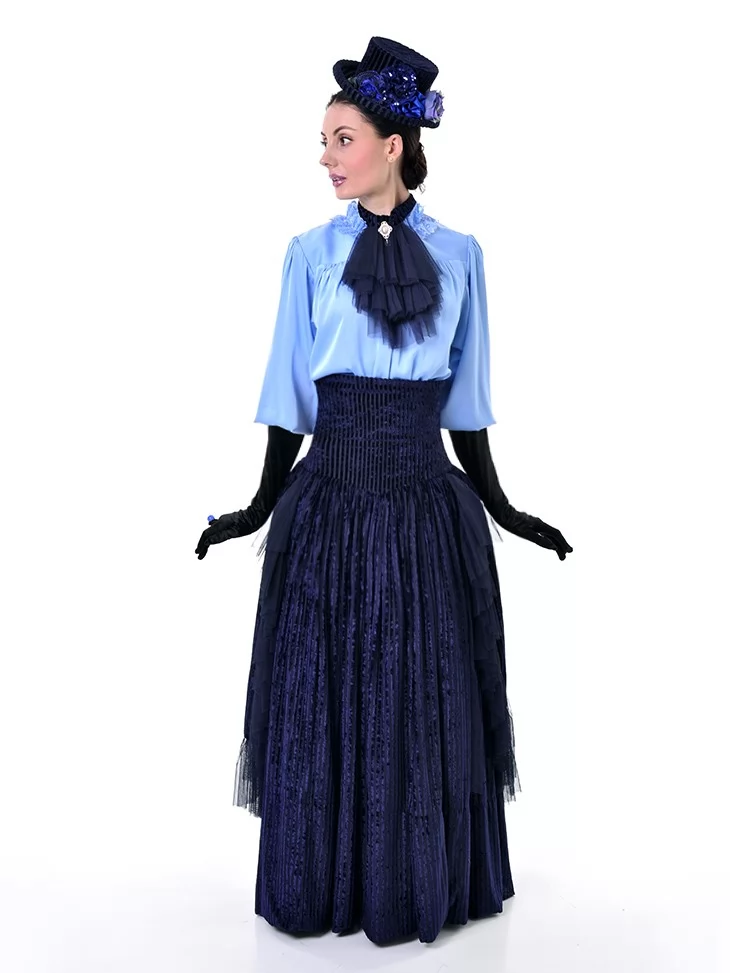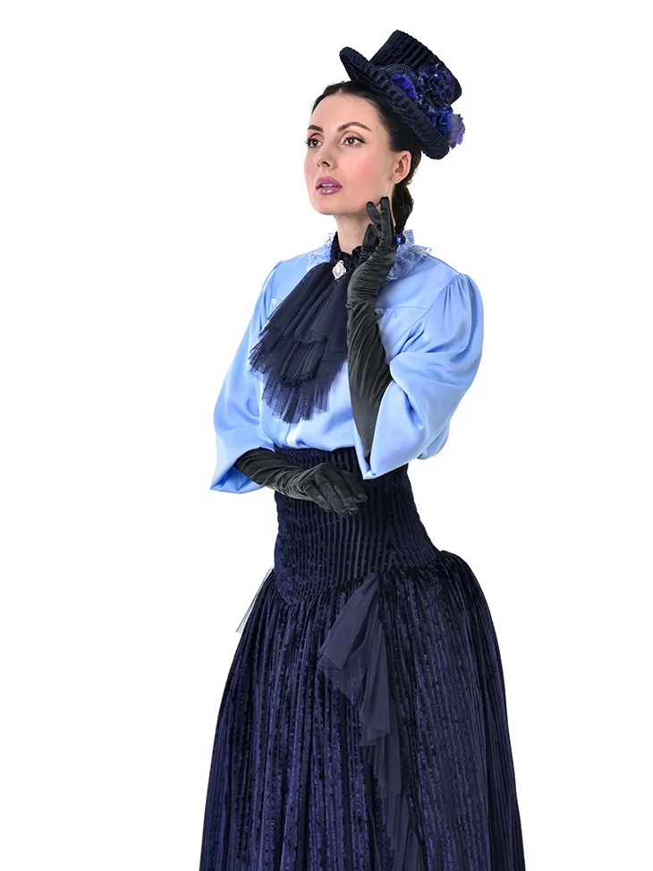 Цей витончений образ у стилі 19 століття виглядає стримано, аристократично та дуже ефектно. Ніжна блакитна блуза з жабо гармонійно поєднується з темно-синьою пишною спідницею та елегантними рукавичками, створюючи справжній настрій салонної моди. Це чудовий варіант для оренди карнавальних костюмів на тематичні події, фотосесії, виступи та історичні постановки.