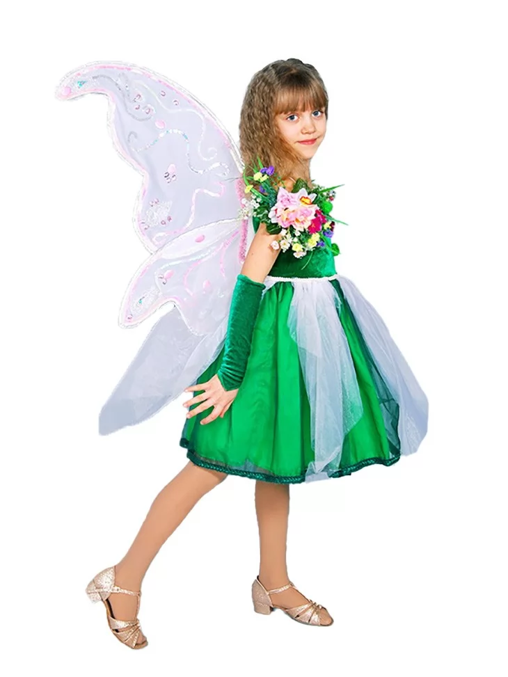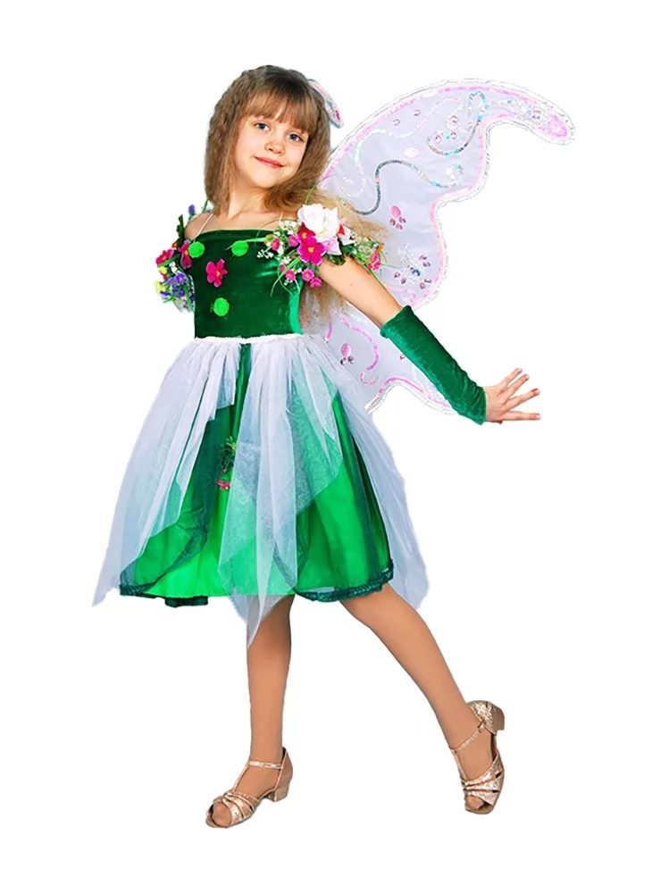 Ніжний природний образ, сповнений магії зеленого лісу, квітів і легкого казкового сяйва. Смарагдова сукня з прозорими повітряними шарами виглядає так, ніби створена з листя та ранкової роси, а великі крила надають образу справжнього чарівного настрою. Це чудовий варіант для оренди карнавальних костюмів на свята, вистави та фотосесії. Костюм виглядає легко, святково й дуже фотогенічно — дитина у ньому ніби перетворюється на справжню мешканку чарівного лісу.