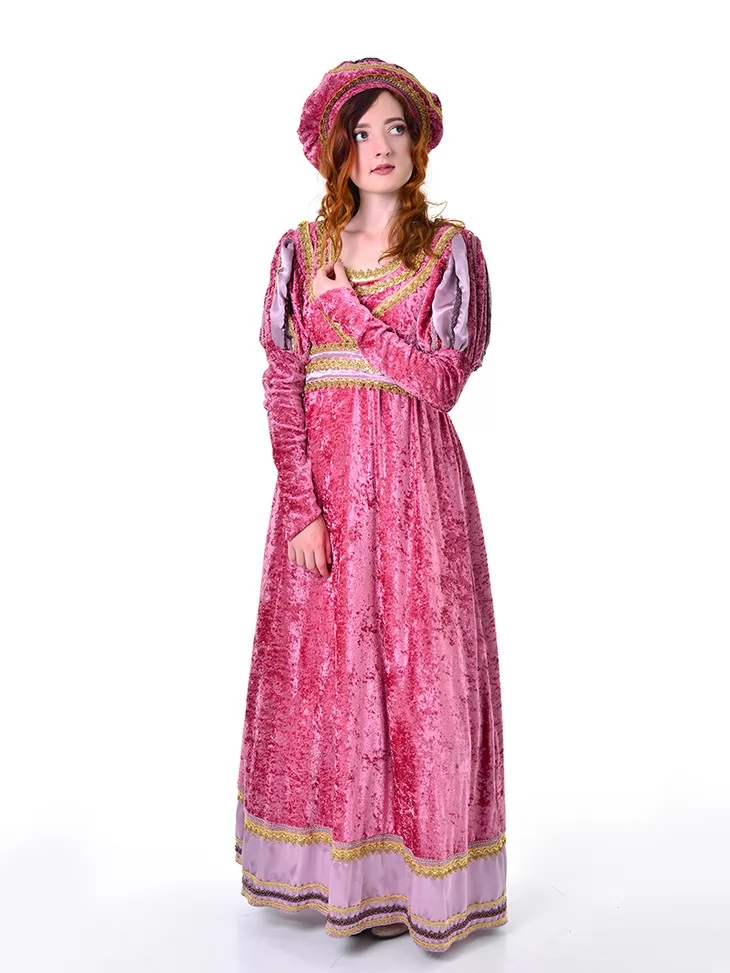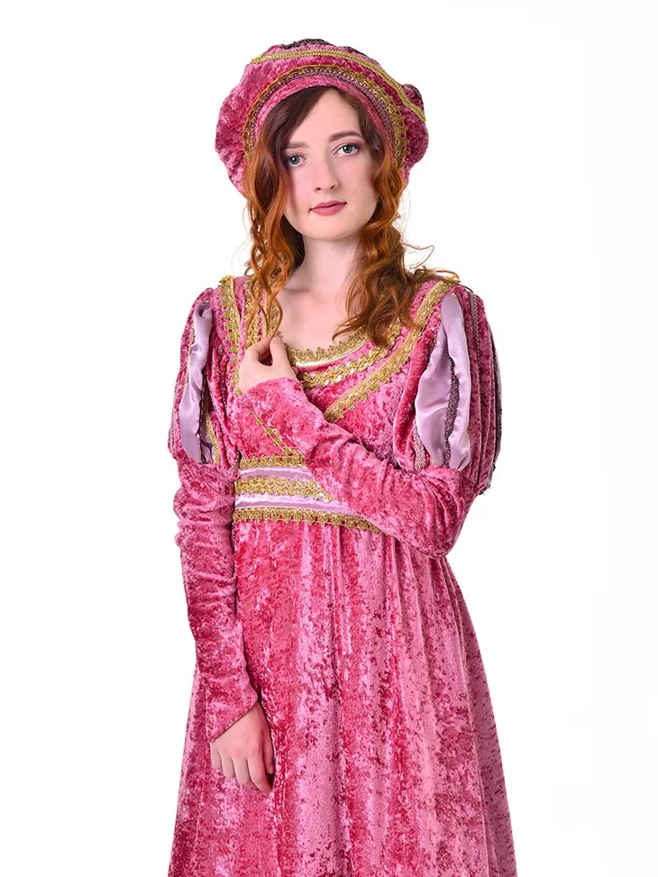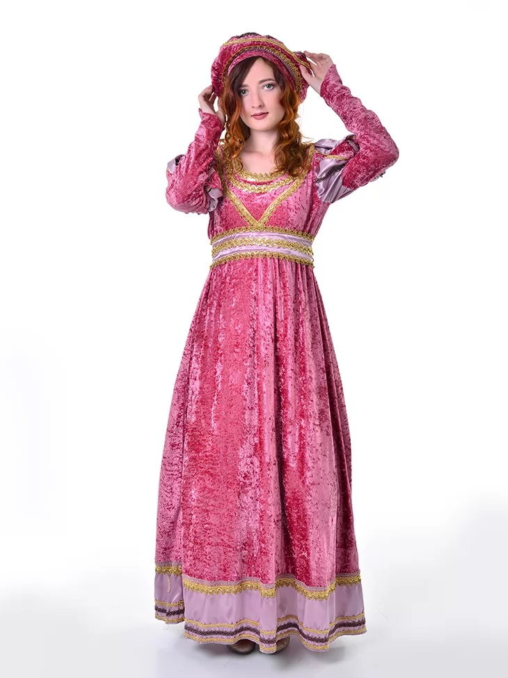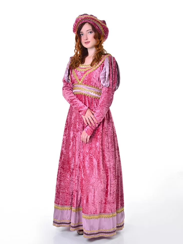 Цей ніжний та романтичний образ Джульєти виглядає витончено, казково та дуже сценічно. Рожева оксамитова сукня з золотистим оздобленням створює атмосферу старовинного балу, а м’які рукави з декоративними вставками додають образу благородства. Головний убір у тон завершує перевтілення та робить костюм по-справжньому впізнаваним. Чудовий варіант для оренди карнавальних костюмів на вистави, шкільні постановки, фотосесії та святкові події.