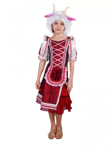 Веселий та впізнаваний казковий образ кізоньки, який ідеально підходить для дитячих вистав та святкових ранків. Яскрава червона сукня з декоративним фартушком, білим мереживом та корсетною шнурівкою виглядає святково й дуже сценічно. Образ доповнює кумедний головний убір із ріжками та вушками, що робить персонажа одразу впізнаваним. Такий варіант чудово підходить для оренди карнавальних костюмівна казкові постановки, новорічні ранки та дитячі святкові заходи.