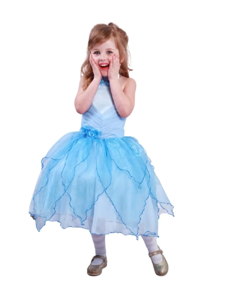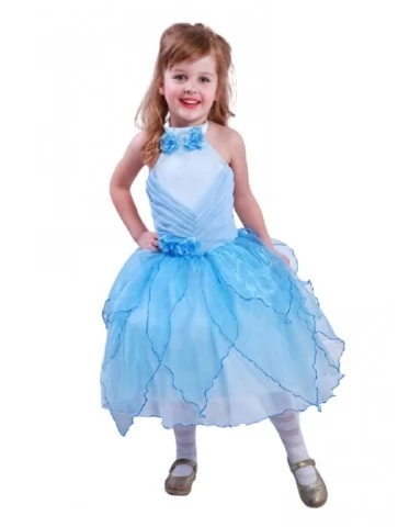 Ніжний, повітряний образ, що виглядає як справжня казка у русі. Легка напівпрозора спідниця з хвилястим краєм створює ефект пелюсток або хмаринок, а акуратний ліф м’яко підкреслює силует дитини. Це чудовий вибір для оренди карнавальних костюмів на свята, ранки, фотосесії та урочисті події, де хочеться ніжності й чарівності в кожній деталі.