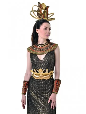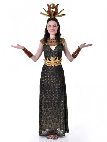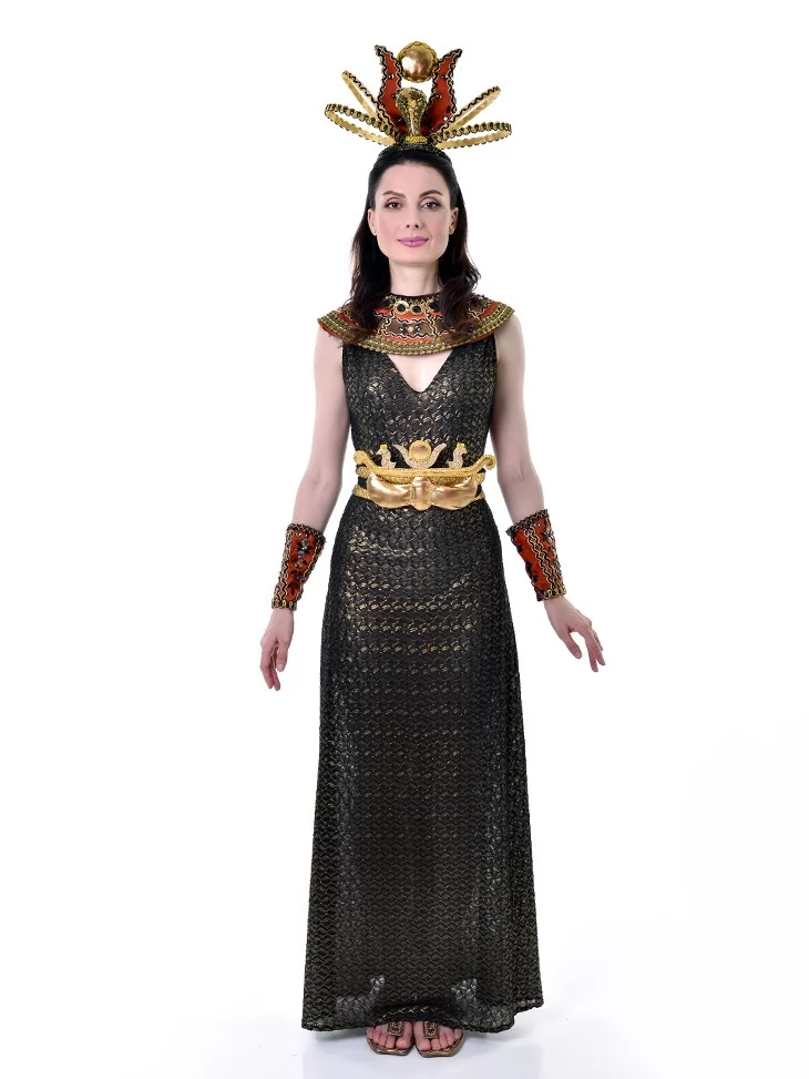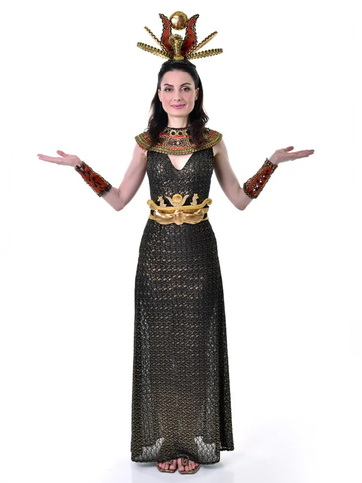 Цей розкішний костюм Єгипетської Богині підкорює блиском люрексової тканини, витонченим силуетом і фантазійним головним убором у формі сонячного диску з коброю. Червоні акценти на золотому фоні надають образу характеру й царської енергії. Завдяки послузі оренда карнавальних костюмів, ви зможете миттєво перевтілитися в богиню сонця.