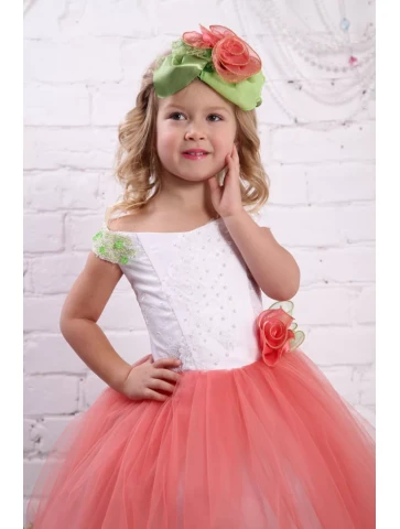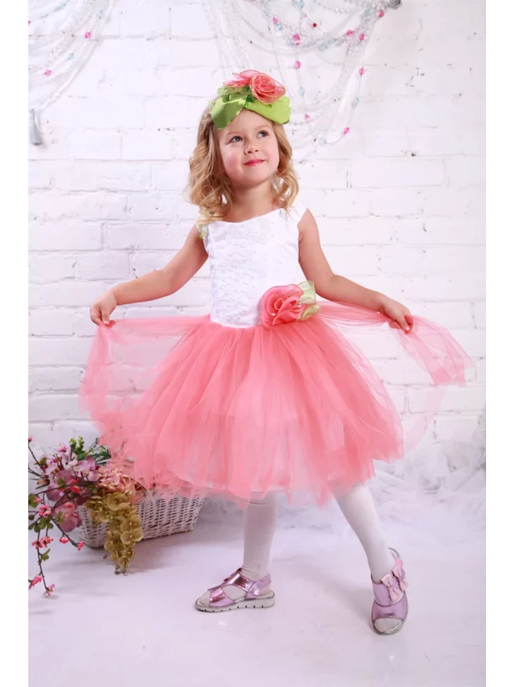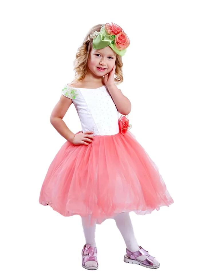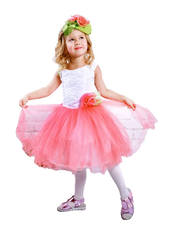Ніжний квітковий образ, сповнений легкості, рожевого сяйва та чарівної святкової м’якості. Білосніжний верх із делікатним блиском красиво поєднується з повітряною фатіновою спідницею ніжно-рожевого відтінку, створюючи ефект живих пелюсток троянди у русі. Декоративна квітка на талії додає образу виразності, а квітковий головний убір підкреслює природну ніжність силуету. Цей варіант ідеально підходить для оренди карнавальних костюмів на весняні ранки, фотосесії та дитячі свята.